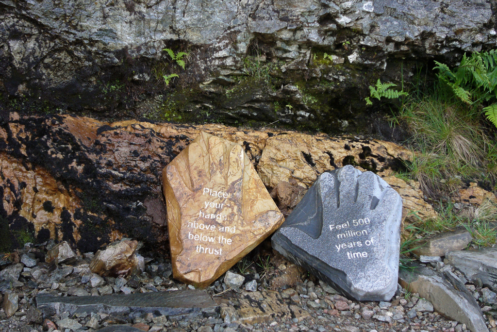 The old grey schist, approx 1000 million years old, is on top of the young white limestone, about 500 million years difference.