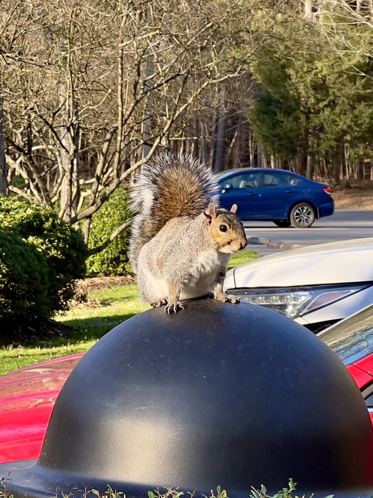 Maybe it’s a live camera to send info to the government if any people throw the wrong thrash in the can😁This one did not even flinch when we pulled up next to him and his garbage can last Sunday at Bond Park. Obviously a well fed, tame, park squirrel, well versed in the art of dumpster diving. My son's red VW is right behind him. I took several pictures, and he wasn't moving from the trash can.😂