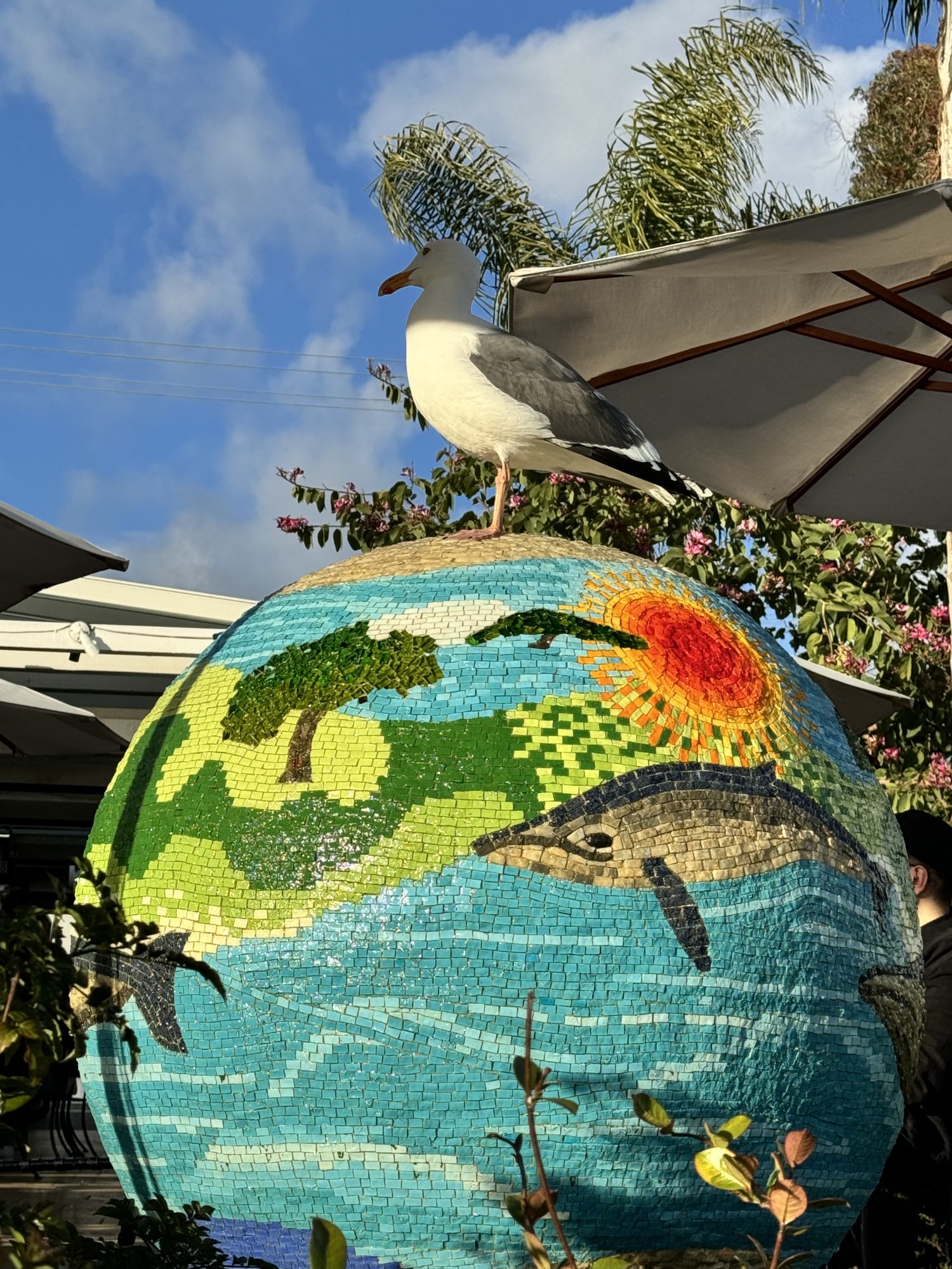 Beautiful photos everyone! This was yesterday at an outdoor cafe in Laguna Beach, the mosaic globe is a fountain and there's almost always one of these birds on top, finally happened to catch a decent shot. iPhone 15 Pro Max, 2x zoom, standard automatic settings.