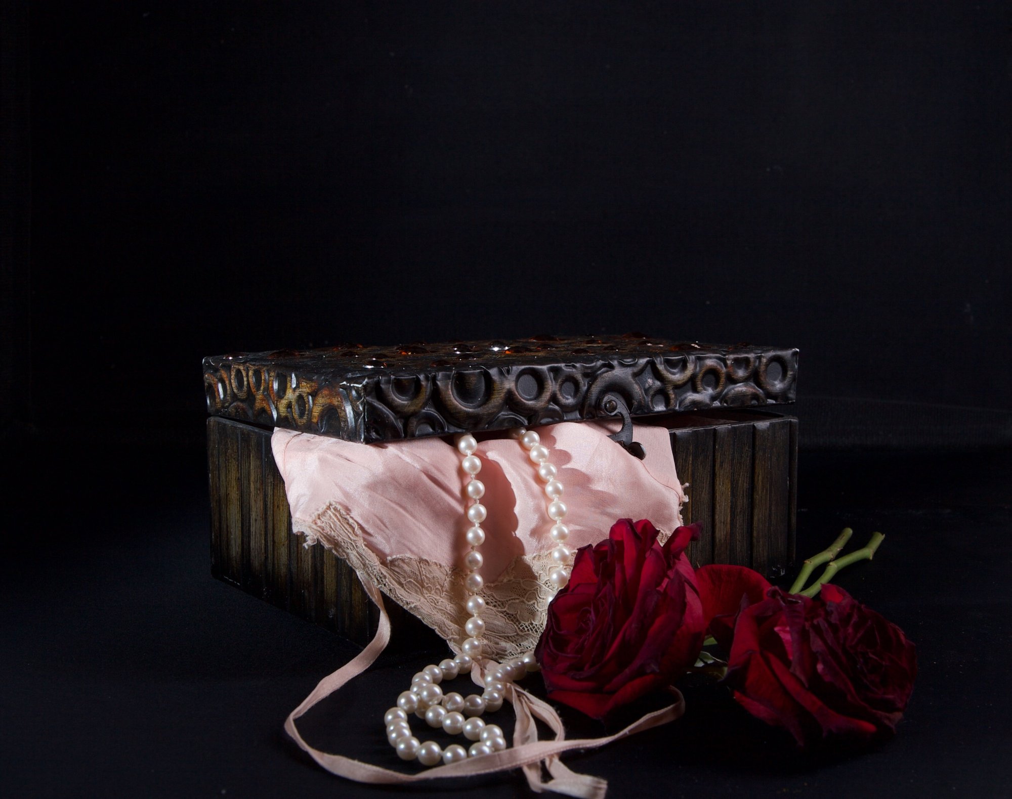 Simply haunting!!! 😇Antique lingerie, mother's pearls, and dead roses...what story does it tell? ~~