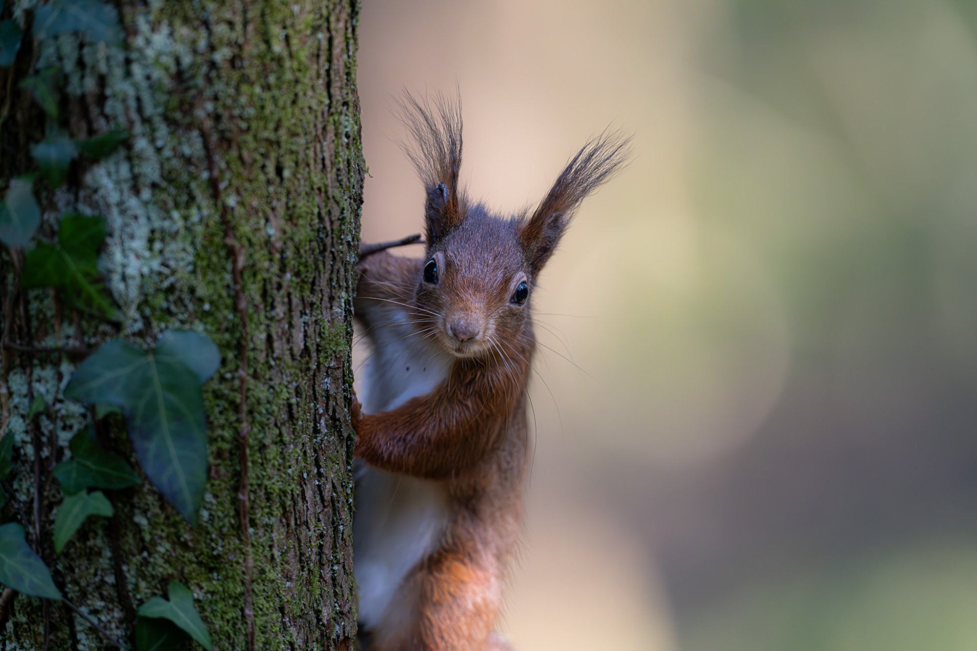 A rare red squirrel hiding near Langefni in Wales, today.