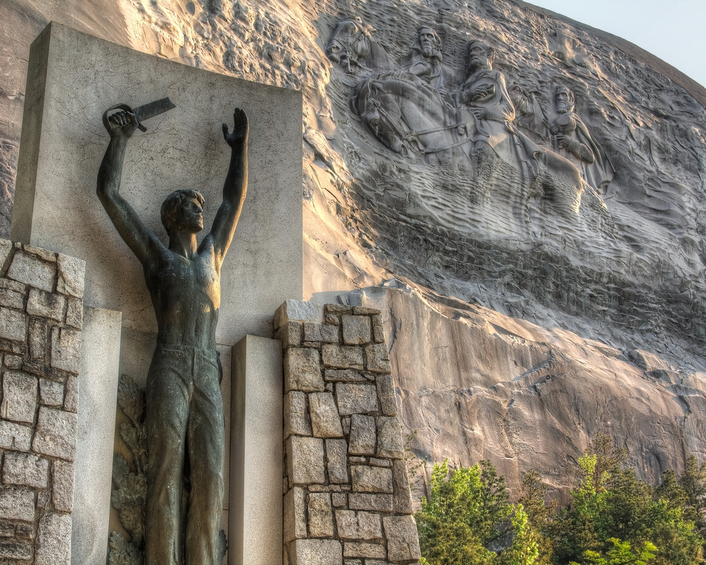 Near the base of Stone Mountain, GA, on the left side is a statue to memorialize the Civil War soldier. In the background is the famous carving on the side of the mountain.