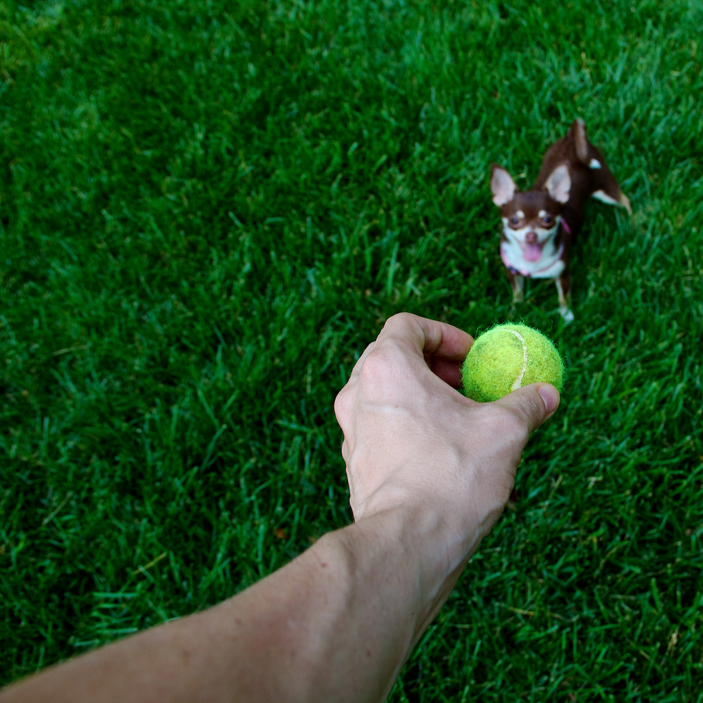 Anyway, today's shot is me playing with a neighbor's puppy. She's not too keen on strangers (first time seeing me, and I started on the Wrong Side of the Fence). But, I had the ball. This presented a difficult decision.