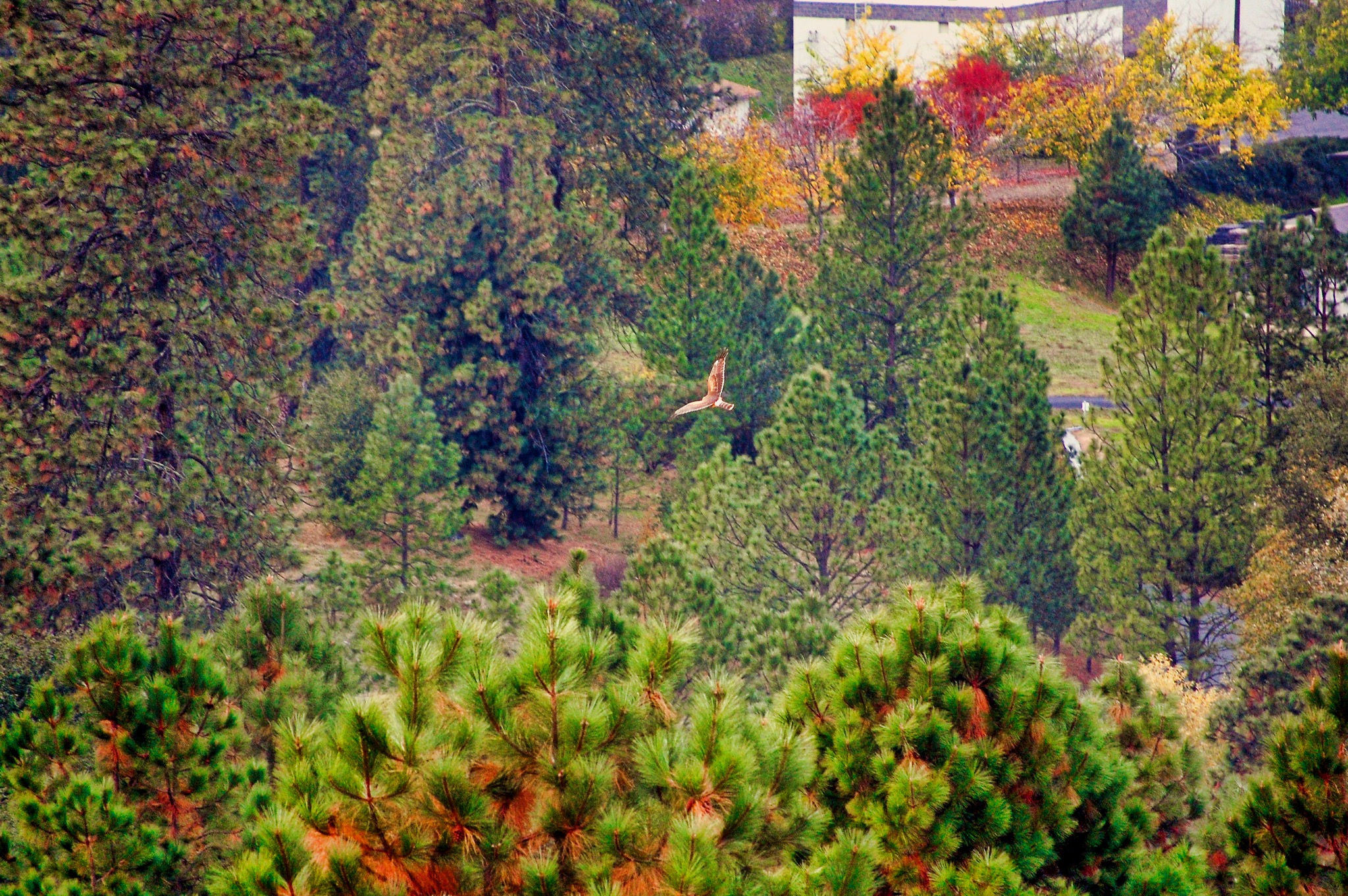 Birds in flight are difficult. Nice job.Hawk against a winery background.