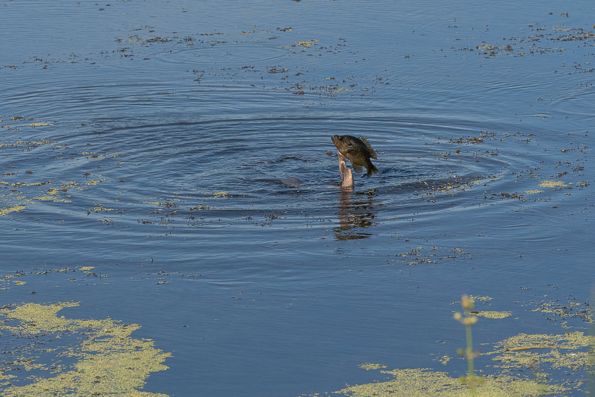 It was a Cormorant (Anhinga). The bass was a little too large so went back down and came up with the bream, ultimately swallowing it. Might post that tomorrow but caught late with just the tip of the tail seen. Never had seen them eating before, so wasn't anticipating it. Also note how they balance themselves with their wings spread along the surface.