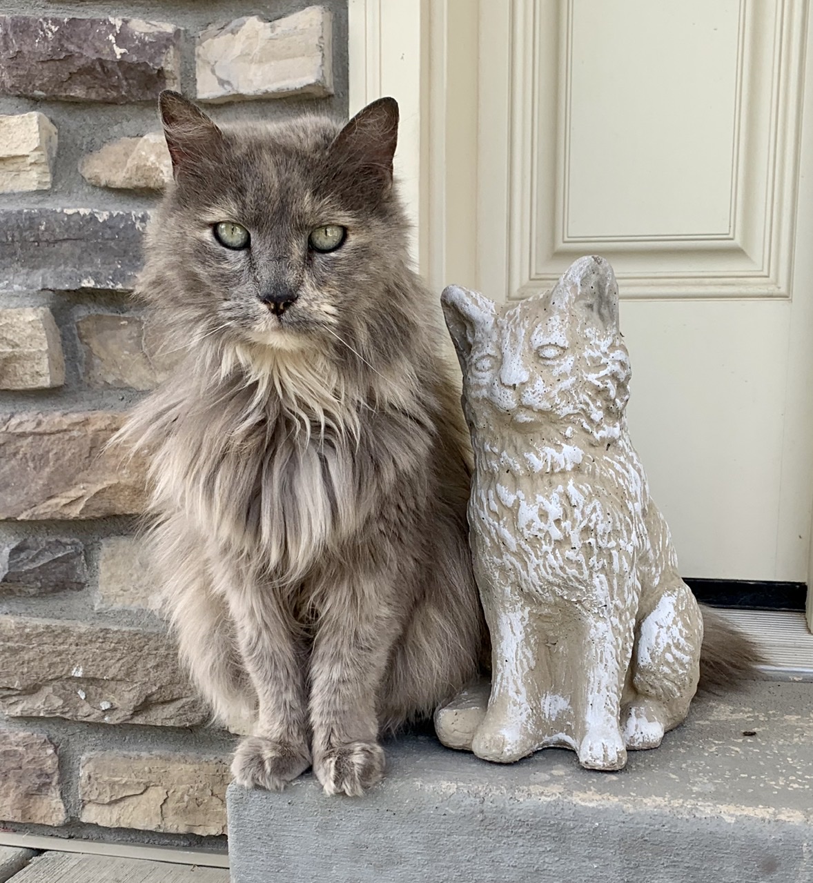 i had just pressure washed the porch and was working on the rocking chairs on the driveway. She was watching to make sure I wasn’t planning on coming back to the porch. The statute gets me every now and then. I’ll wonder what white cat is on the step. Picture wasn’t posed. You can never get her to do anything she doesn’t want to do.Only their mother can tell them apart