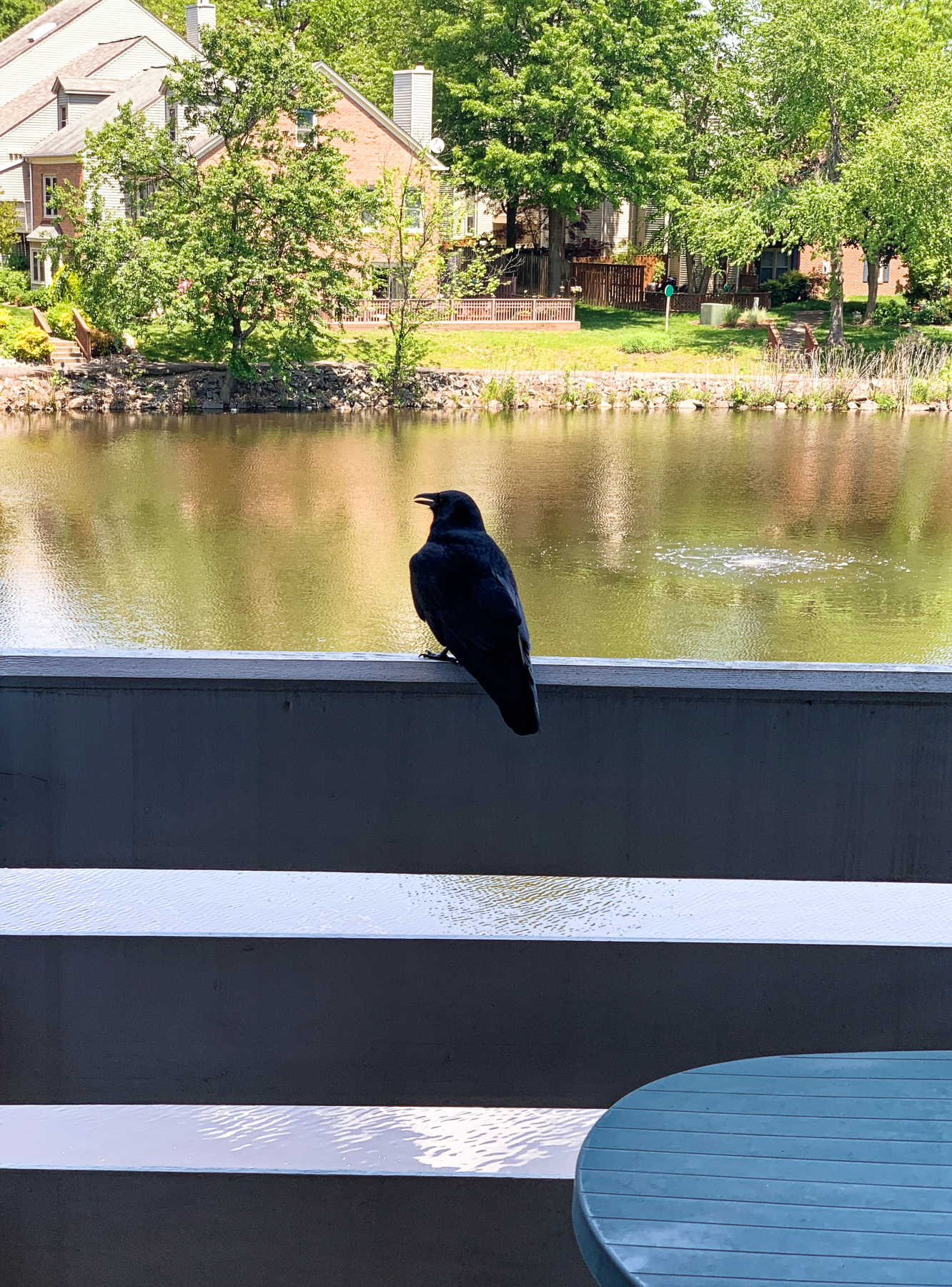 He’s virtually ever present in my garden. Had to young boys with him the other day.Well, after all my talking about how I usually can't seem to shoot small birds, today a blackbird came to call. Literally. I was busy editing images and suddenly heard "caw-caw" rather loud and rather close -- surprised, I glanced out the screen door (glass slider was open) and there he was, big as life, sitting on the deck rail! I grabbed the iPhone, which was the closest camera at hand, and cautiously began shooting, moving very slowly. Eventually I was able to get to the door and shoot through the glass at him.....