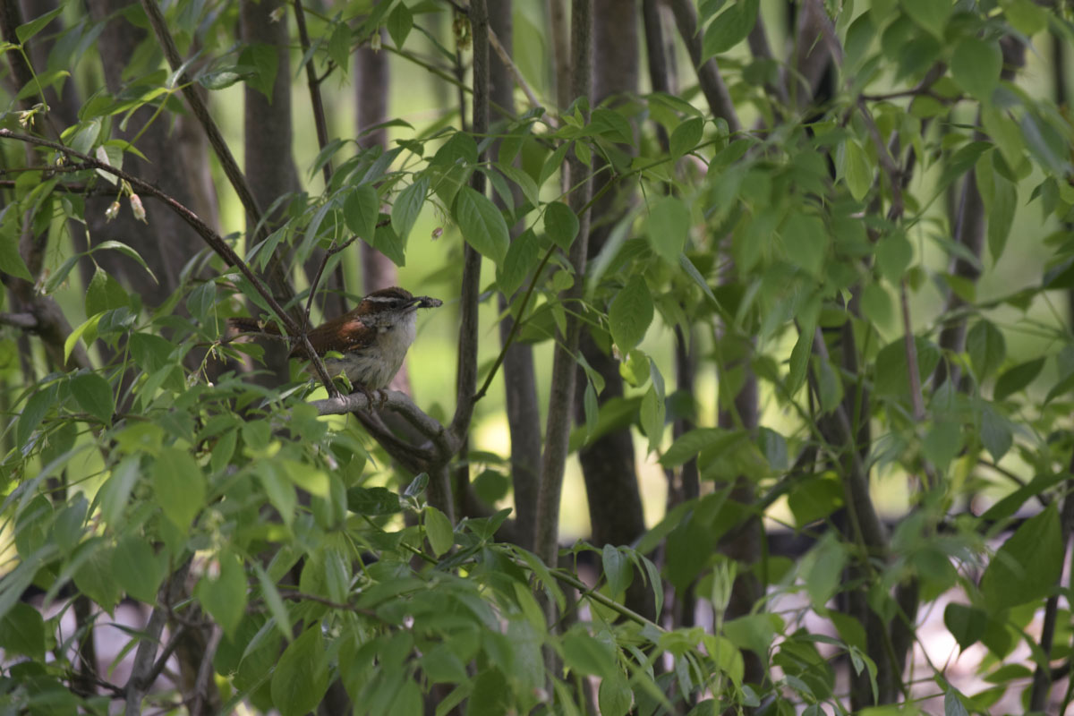 That could be. I know we do have wrens here. Thanks!Might be a house wren. Don't know where you are but they are prevalent in Georgia. Fact is I have a pair that made a nest in a shelf in my garage. Two eggs at least, I get "zoomed" by the mother leaving the nest when I venture close.