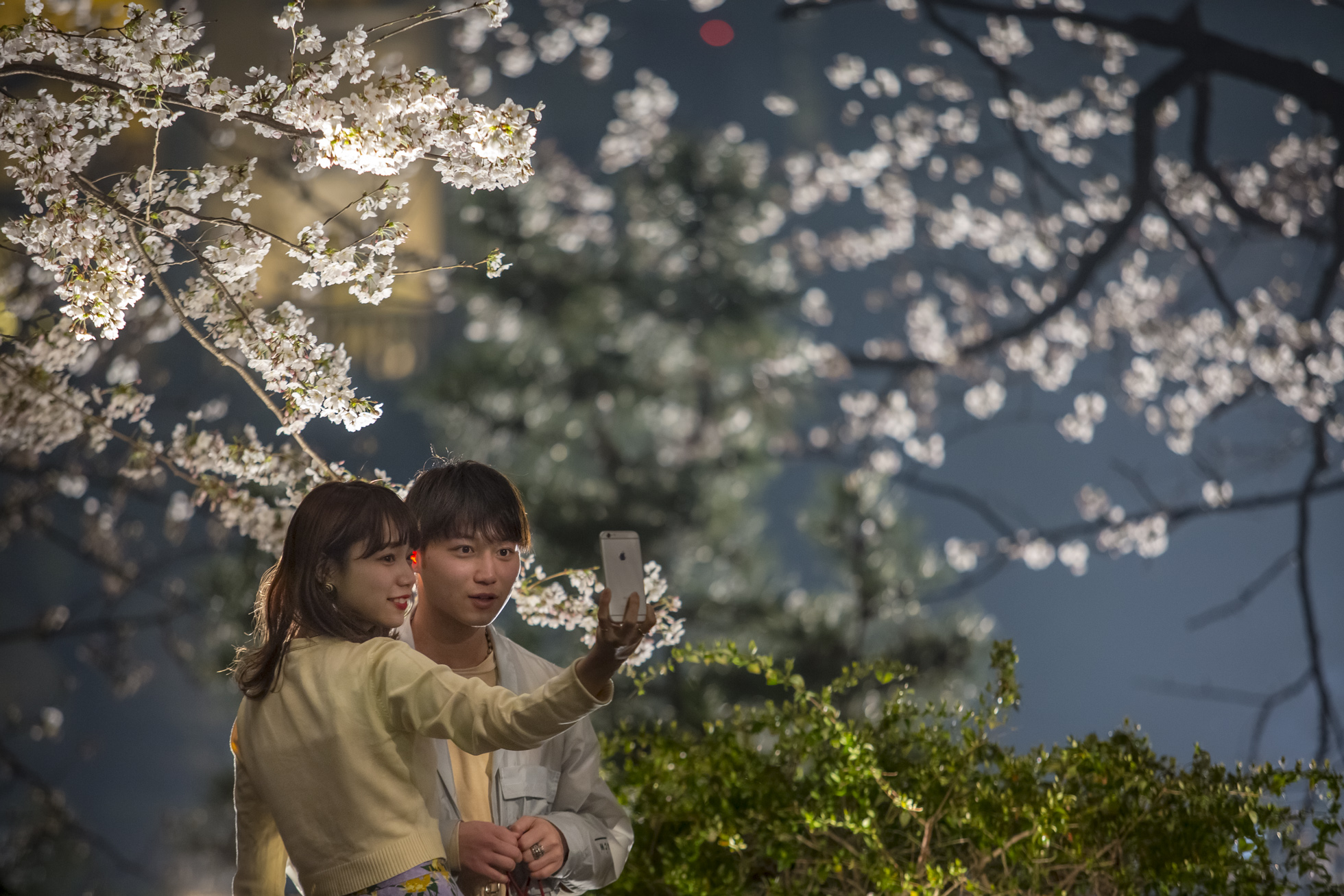 Thanks! There are cherry trees at Fukuoka Castle, and during the spring when the trees are in bloom, they shine lights on the trees around dusk and into the night. It was just a matter of finding the right location and being patient.Such a nice photo of a cute young couple. Love the lighting!