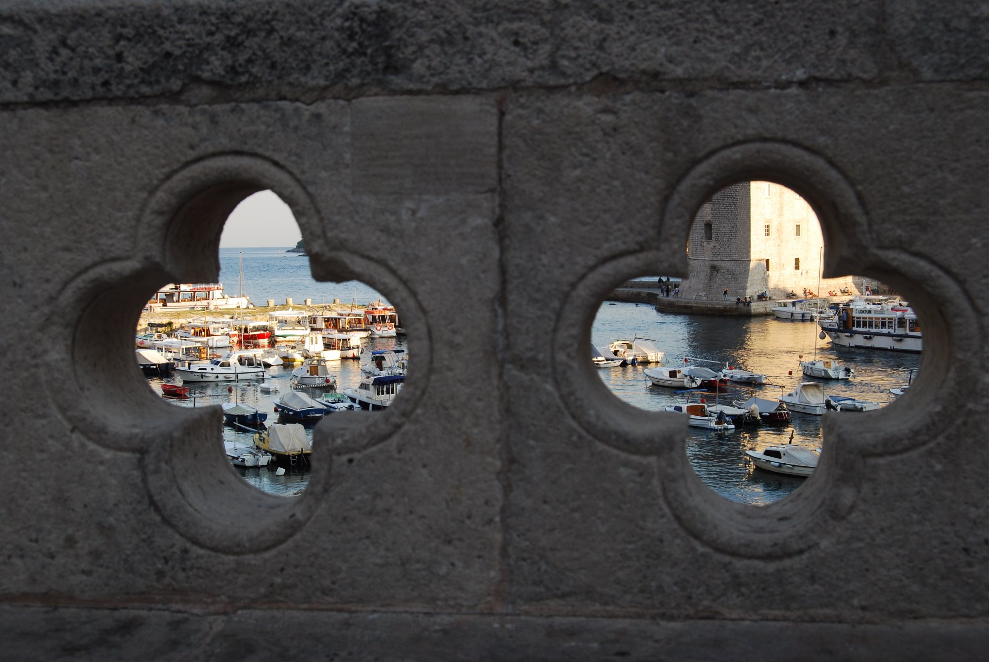 Harbor in Dubrovnik, Croatia through a stone wall, September 2012.