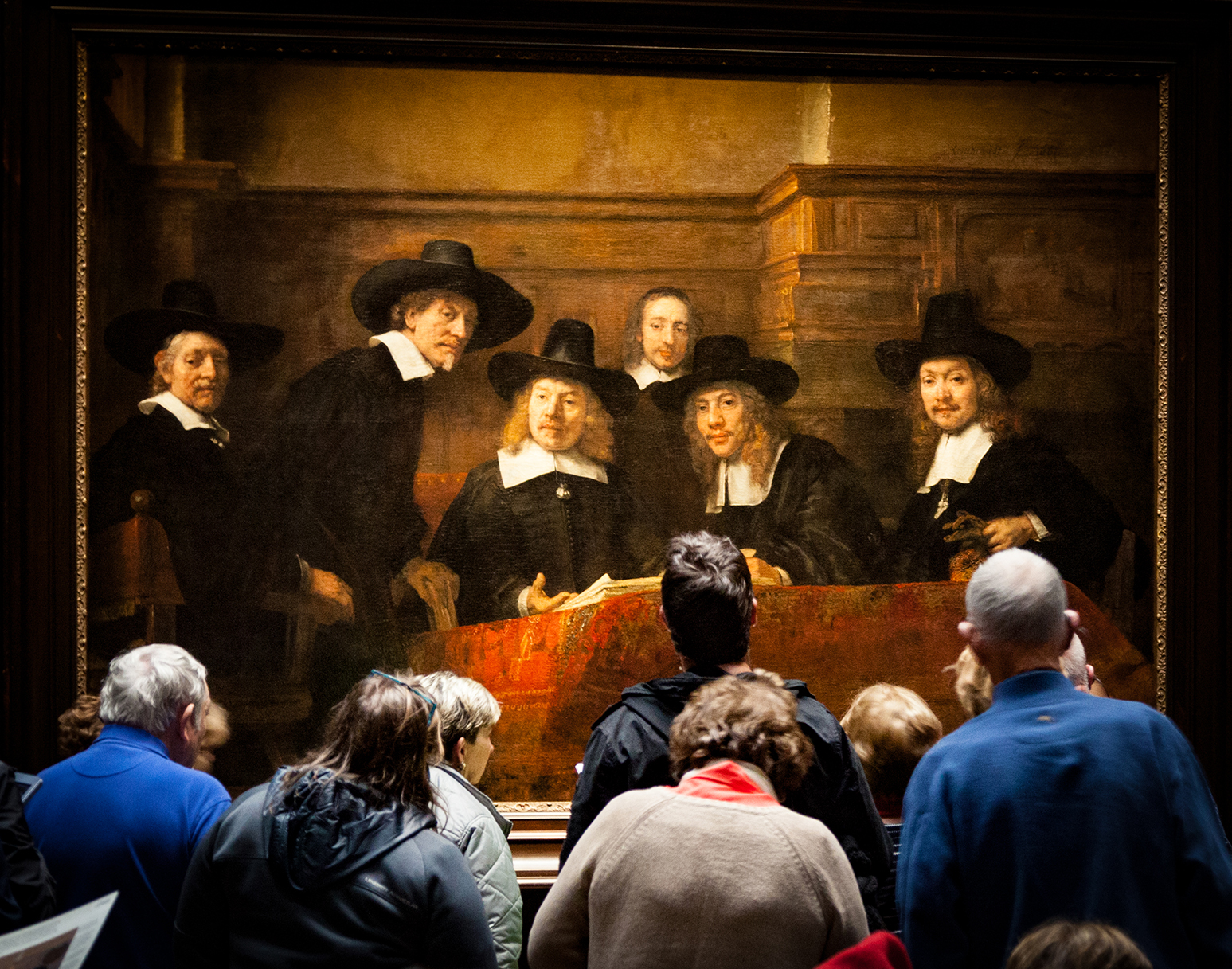 Agree. It looks and feels like the men in the painting are discussing something with someone or a group of people. It seems that each is looking to a person in the crowd, while another looks at someone or something past the people in front.I am a huge art person and love going through any museum or art galleries or simply walking the streets. but I find the interaction between art and people almost more interesting than the art itself... This piece by rembrandt is so great because the subjects really appear to be looking at the spectators in wonder... and when you take the time difference into account you can really imagine that the people in the painting would be more at a loss for words than the people in it time. Art is such a beautiful thing that can bring wonder at any moment and any time.