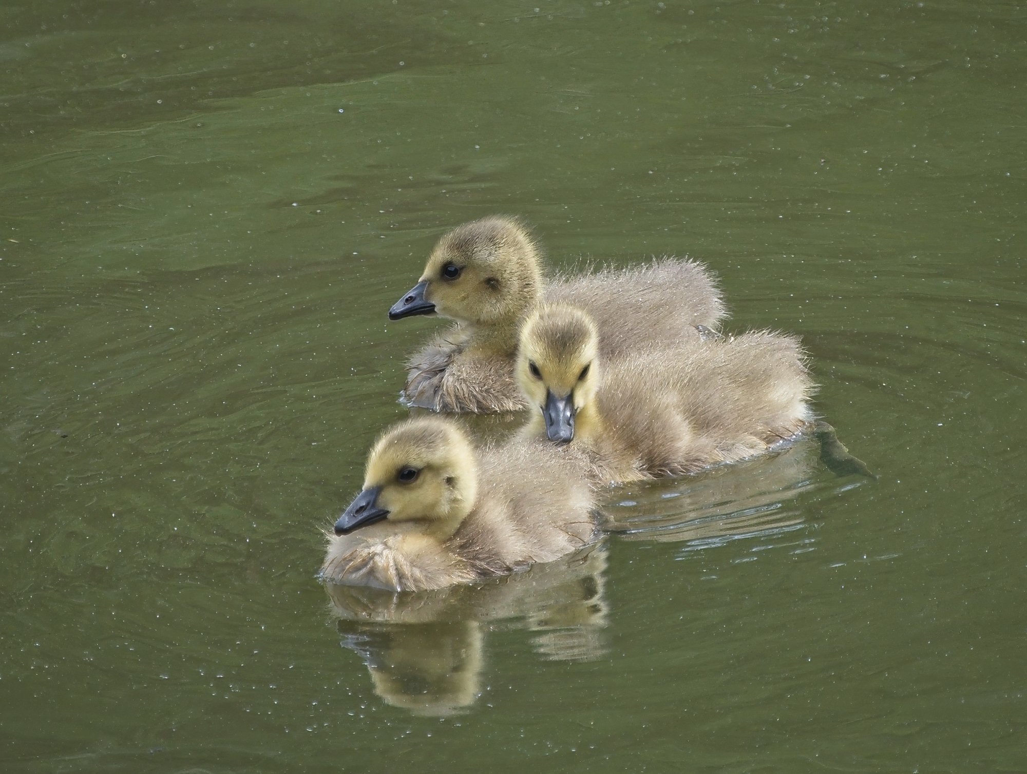 What cuties!A little sibling nibbling...... Yesterday was a lucky one for me when Mother Goose and her three surviving goslings (I'm guessing a predator got the fourth one) came swimming by on my side of the lake. At one point there was enough distance between the mother and her offspring for me to get some shots of just the three wee ones. Yes, the guy in the middle is nibbling at the fuzzy down on his sibling's back!