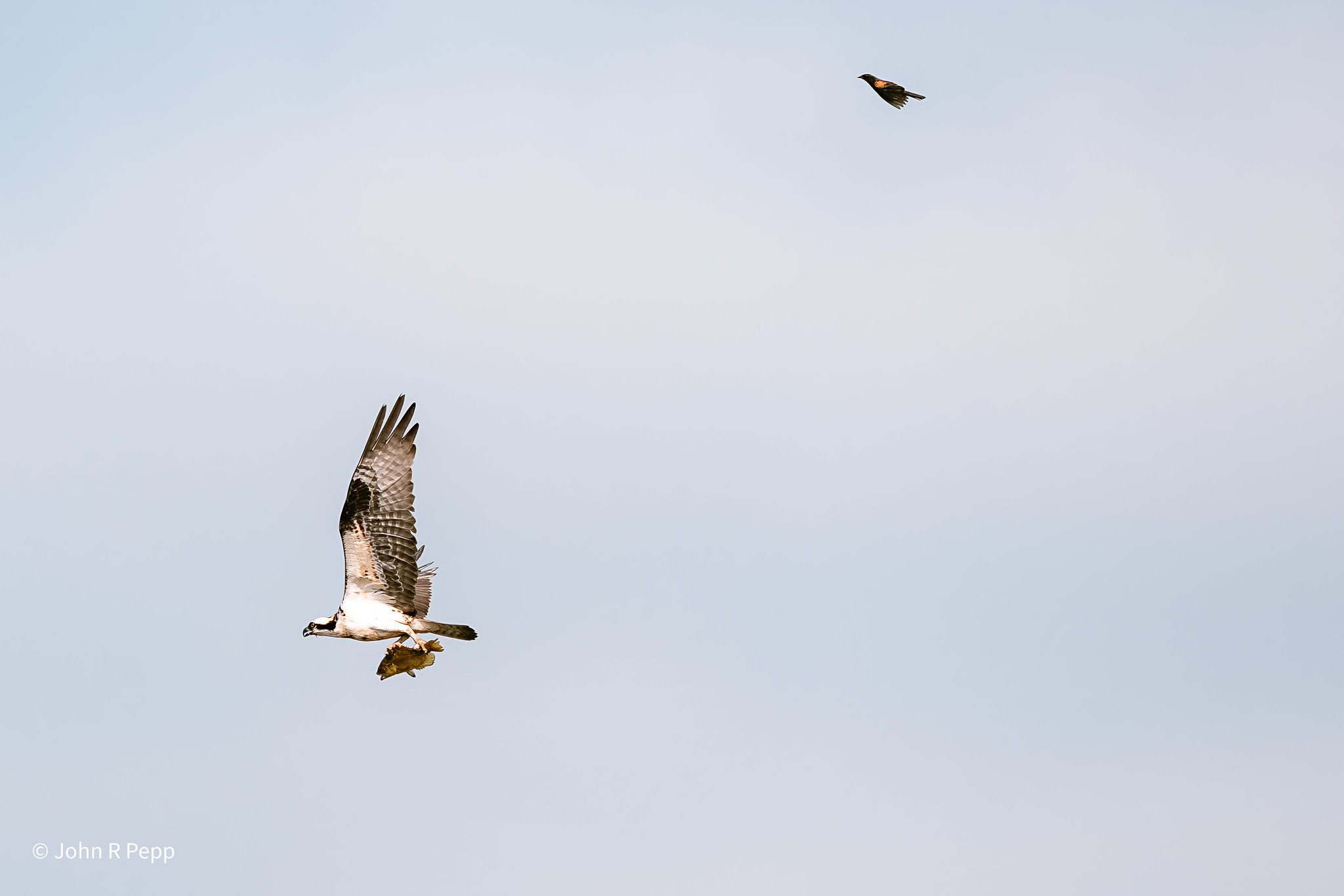 I regretted removing my 1.4x Teleconverter from my lens. Although I had taken it off due to the cloudy forecast and my hopes of getting close-up shots of a Belted Kingfisher, those plans changed. Instead, I captured some fascinating shots of an Osprey with its catch being harassed by what appeared to be a Red-winged Blackbird. It was quite entertaining to watch such a small bird chasing the much larger Osprey. (Nankin Lake: Wayne County)