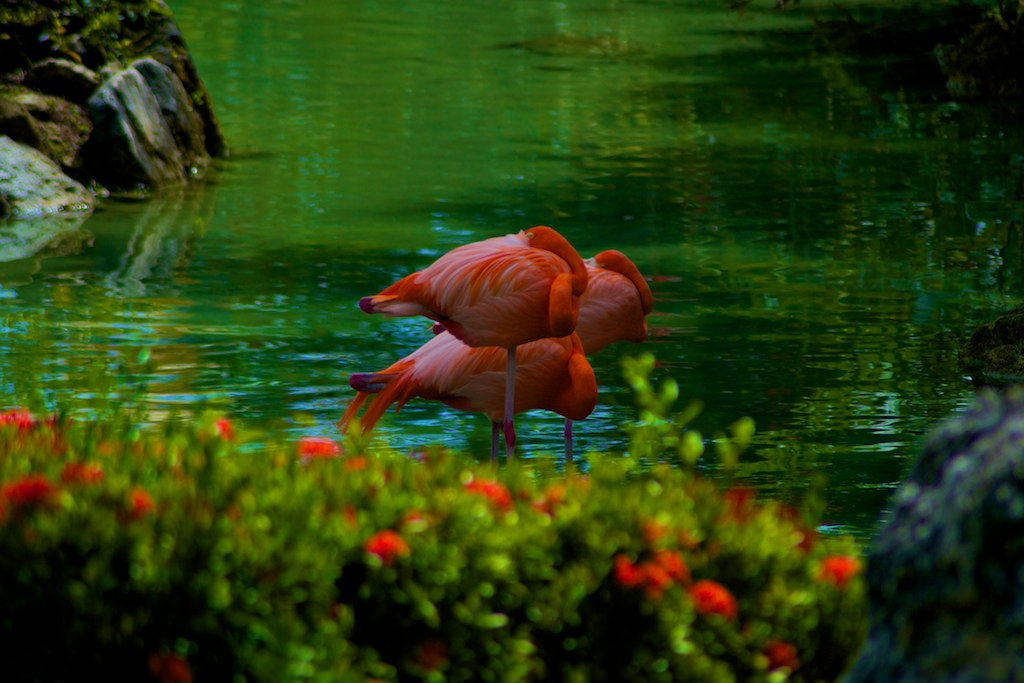 Flamingos by Michael Cascio, on FlickrWater with olive oil and food colourings and a tiny bit of flour sprinkled for effect. Then a bit of photoshop magic- Solarise and tilt/shift.Lovely - would you mind sharing what liquids & lighting you used?