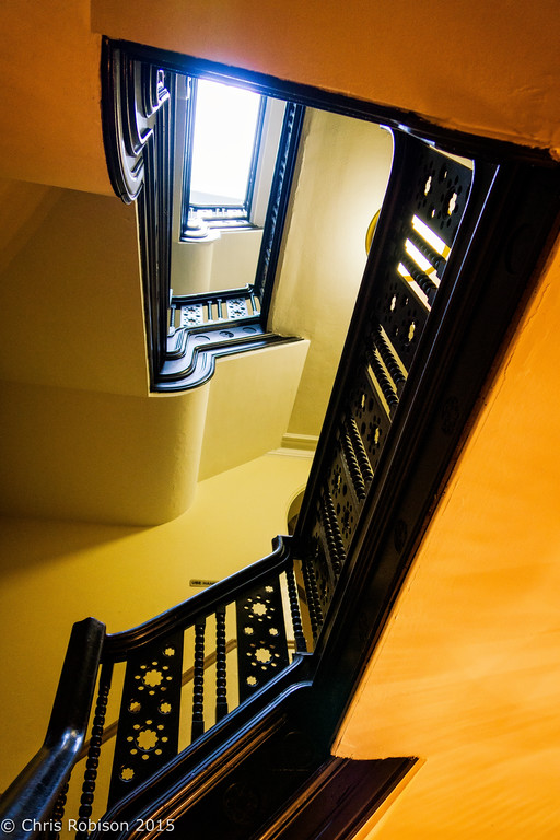 Wow, lovely work on the bannister! nice contrasts between light and dark. Could you do anything to soften the clipped highlights at the top maybe?