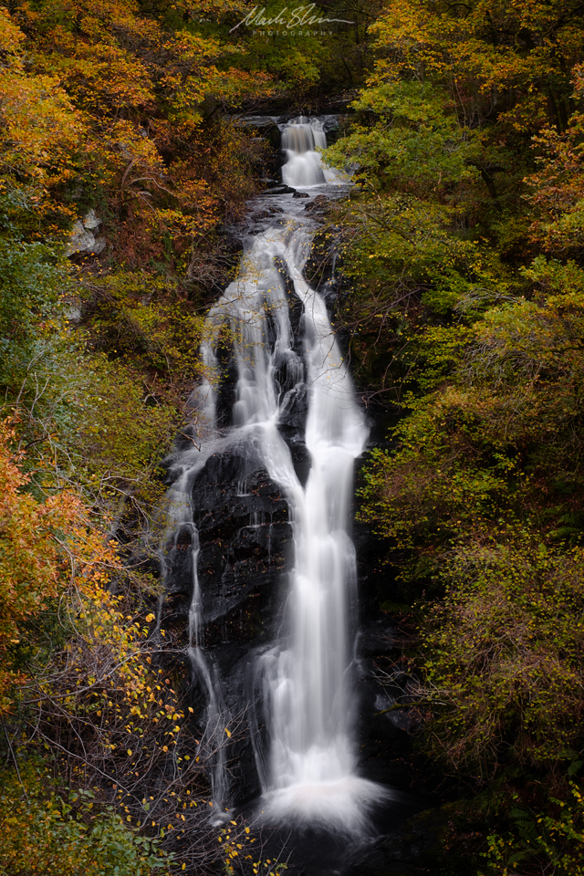 The Black Spout is an impressive waterfall located in woodlands on the edge of Pitclohry. Cumulatively, the upper section and main falls have a drop of more than 60m. I reckon October is the best time to view the falls, because fantastic Autumn colour forms a veil on each side with an ample stream of water cascading down.