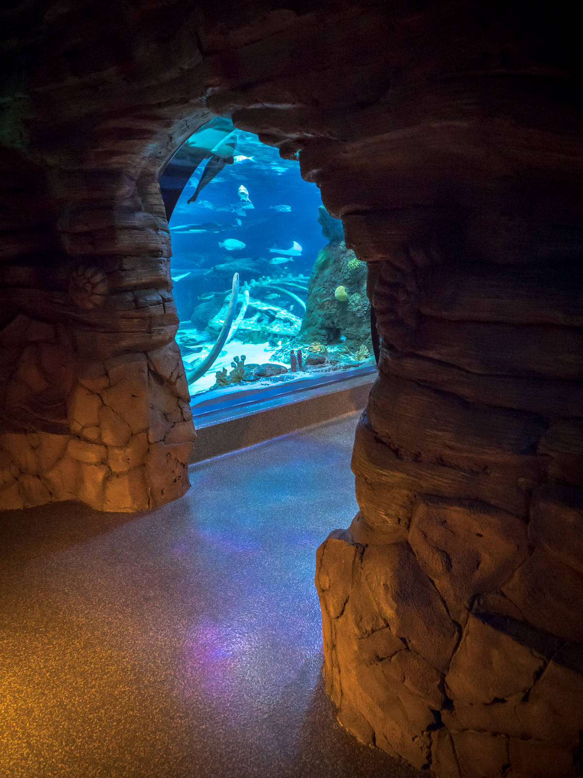 Local aquarium. G9 with PL12-60 @ ISO 2000, 1/25 F3.2. Enough DR to pull out the rock detail in the foreground, but enough shutter to capture the moving sealife. It's a pretty dark setting, so the goal was to match the mood of the original scene.