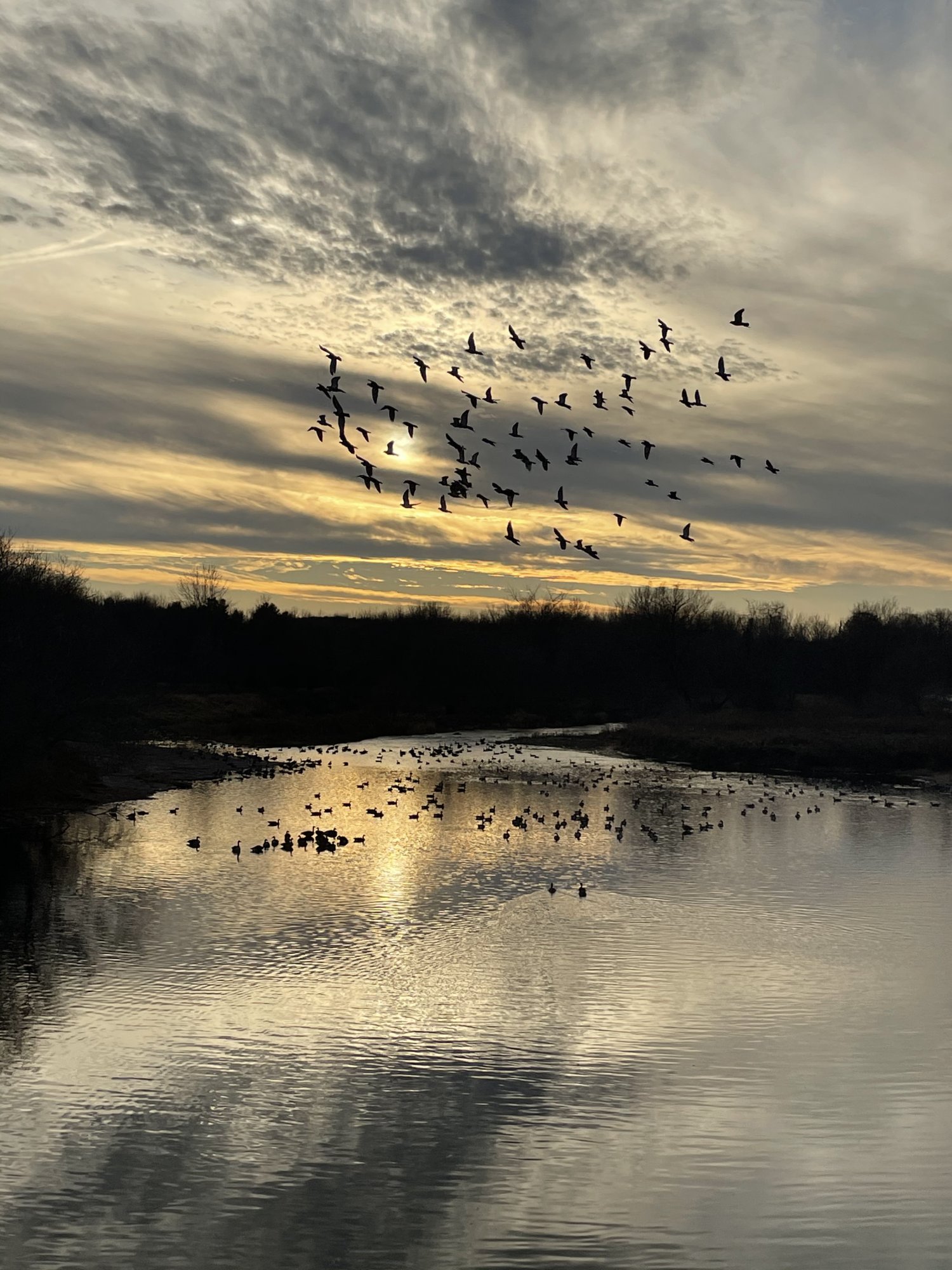 Birds in Northern New York. Taken with iPhone 12. Auto adjusted in photos app. One of the most beautiful moments I’ve ever seen in my life. Unsure what kind of birds are flying but the birds on the water are geese.