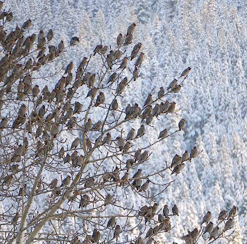 Bohemian Waxwings in a cottonwood, from about 40 meters away.