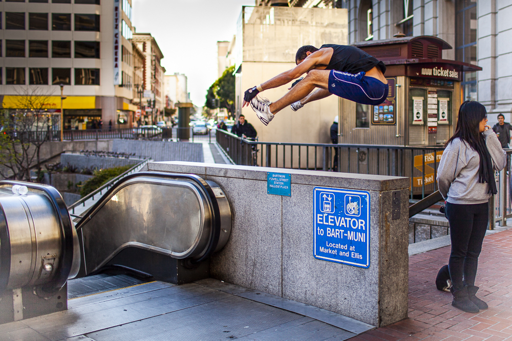 What I love about this is the woman looking the other directionHe's a banker who works in San Francisco's financial district. And for lunch he runs through the downtown, jumping over anything that's jumpable; trash cans, newspaper racks, walls, etc. No doubt in my mind he could jump over some cars.