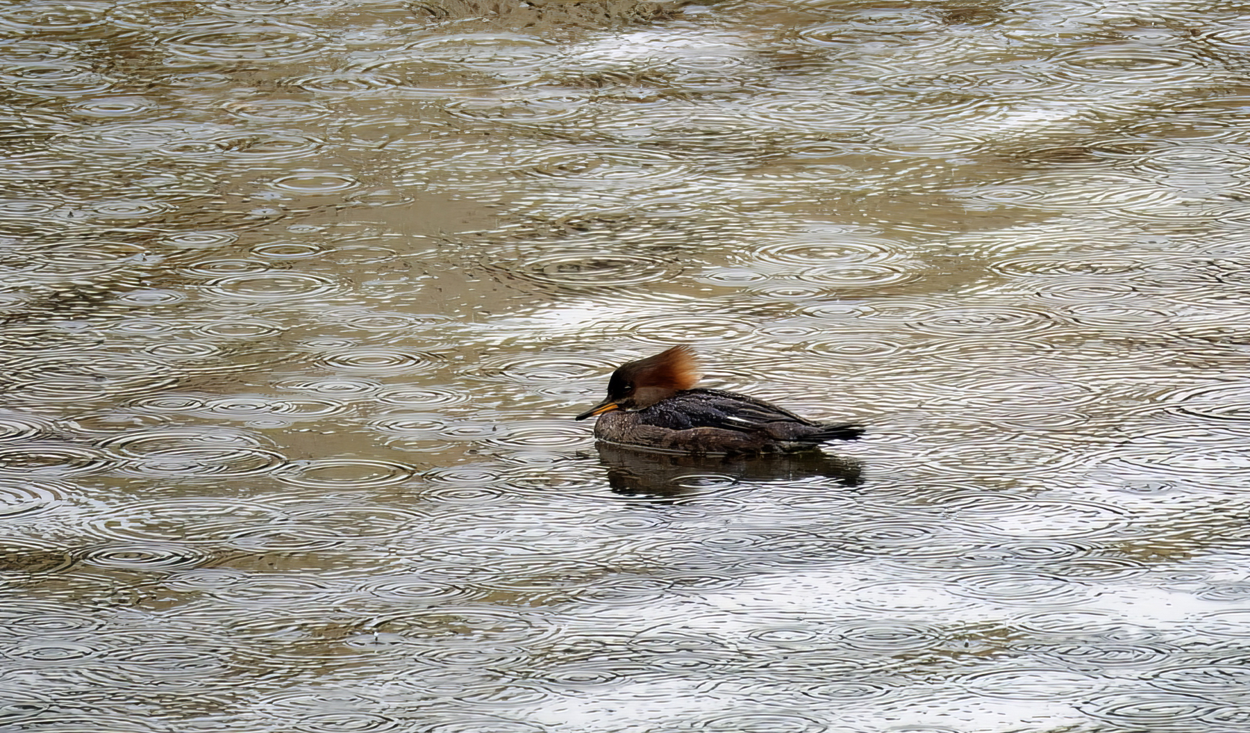 I hope that none of them takes water over their head😁One of the two female Hooded Mergansers out on the lake in the pouring rain: