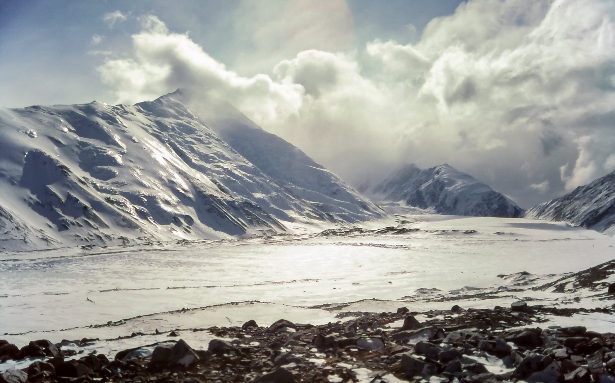 That sure provides some scale to the magnitude of the scene.Taken from the same spot as yesterday's pic (at McGonagall Pass) but looking in the other direction, following our route up the Muldrow Glacier. The summit of Denali is still 10 miles away as the crow flies (and over 14,000’ above us) and we’d already snowshoed about 20 miles from a frozen Wonder Lake to get there. Cold & windy - temperature measured on previous day was about -30F. Note at lower left, there is a Park Service dog sled patrol headed toward us.