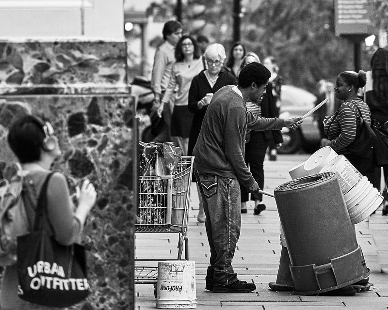 Cheers Oblomow, much appreciated. Believe it or not, I was rather pleased to capture the headphone-guy looking towards the drummer and the drumstick pointing to the woman on the right: a sort of line of interest. Thought the headphones added a bit to the musical theme. I see what you mean about distraction though.I like the scene. And B/W always seems to work with streetphotography. The person with the headphones on the right is distracting. It took me some time to discover that is was a real person and not a urban outfitter ad on a billboard. So perhaps if you had moved more to the right, it would have been easier for my brain.