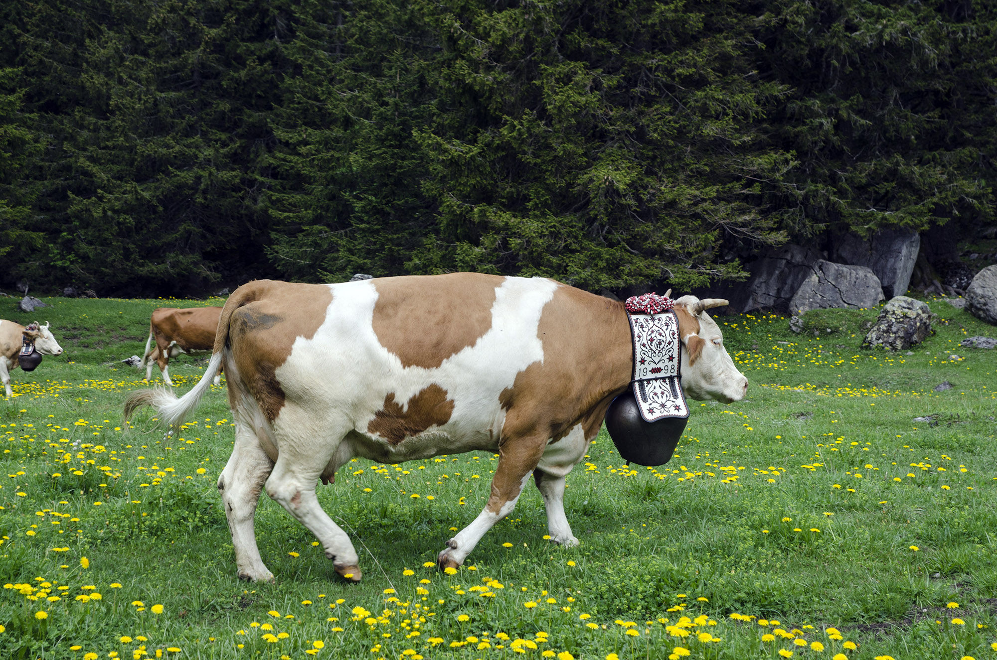 San Luis Valley Ranch by Ray Harrison, on FlickrHow much does a bell like that weigh? It does not look comfortableWith the traditional walking of the cows from the lower elevation where hay fed over the winter to the upper elevation where the new growth supports grazing, the lead cow has the largest bell. Each cow has its own bell of different sizes and the sound is amazing as it echoes through the countryside. Done for centuries without horses and before motor vehicles existed, the tradition continues to this day. The process is reversed in 6 months with the return to the lower elevation.