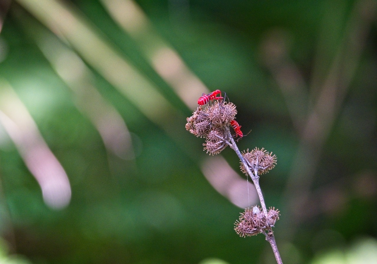 Red bugs on a dried plant.