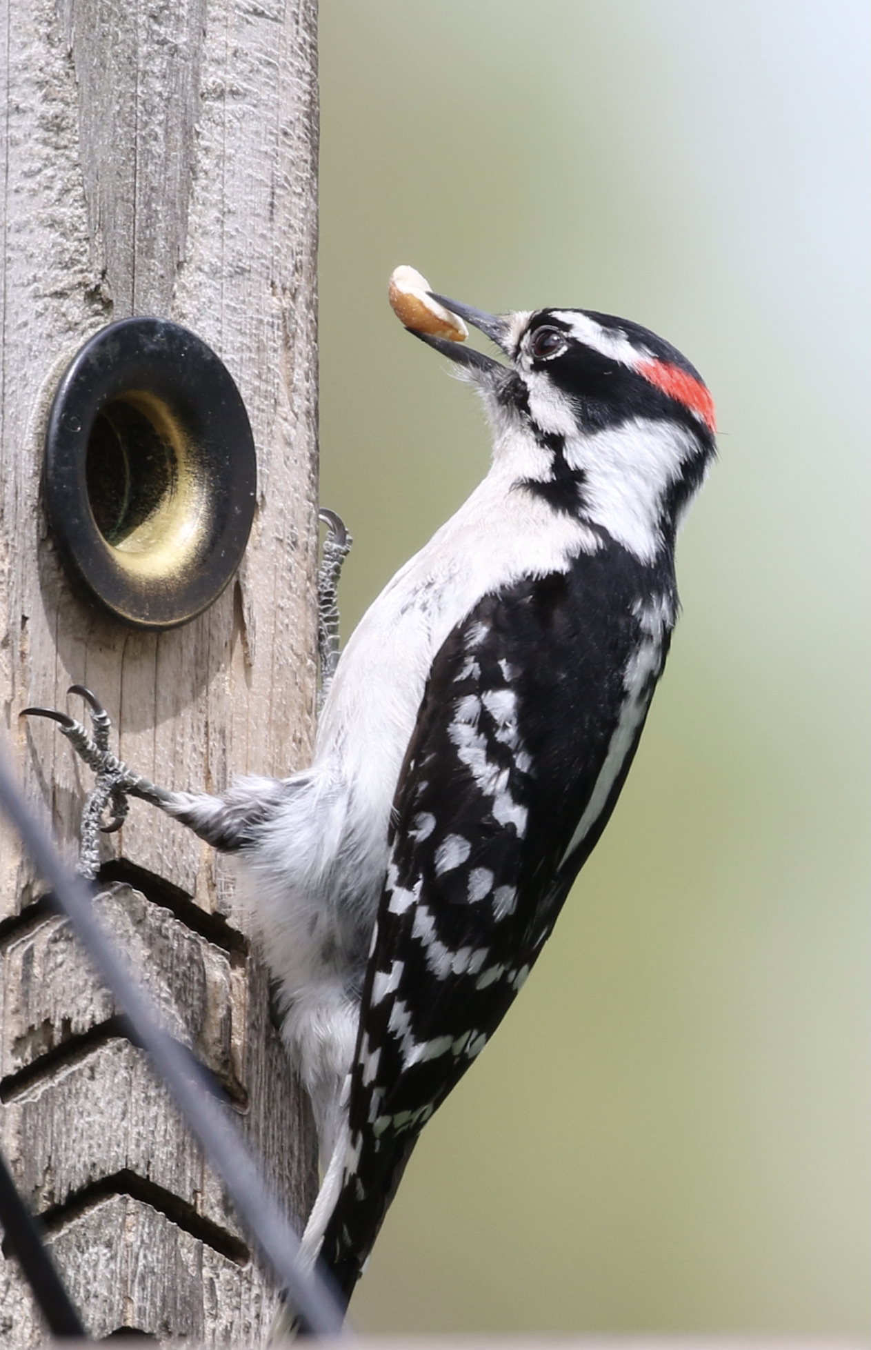 Of all the birds that visit our feeders, the downies are the bravest. I can (carefully) walk out there and, say, (carefully) fill the bird bath with fresh water, and the downies won't fly away.Male Downey Woodpecker enjoying some seeds at our feeder. One of our regular year arounds (male and female)