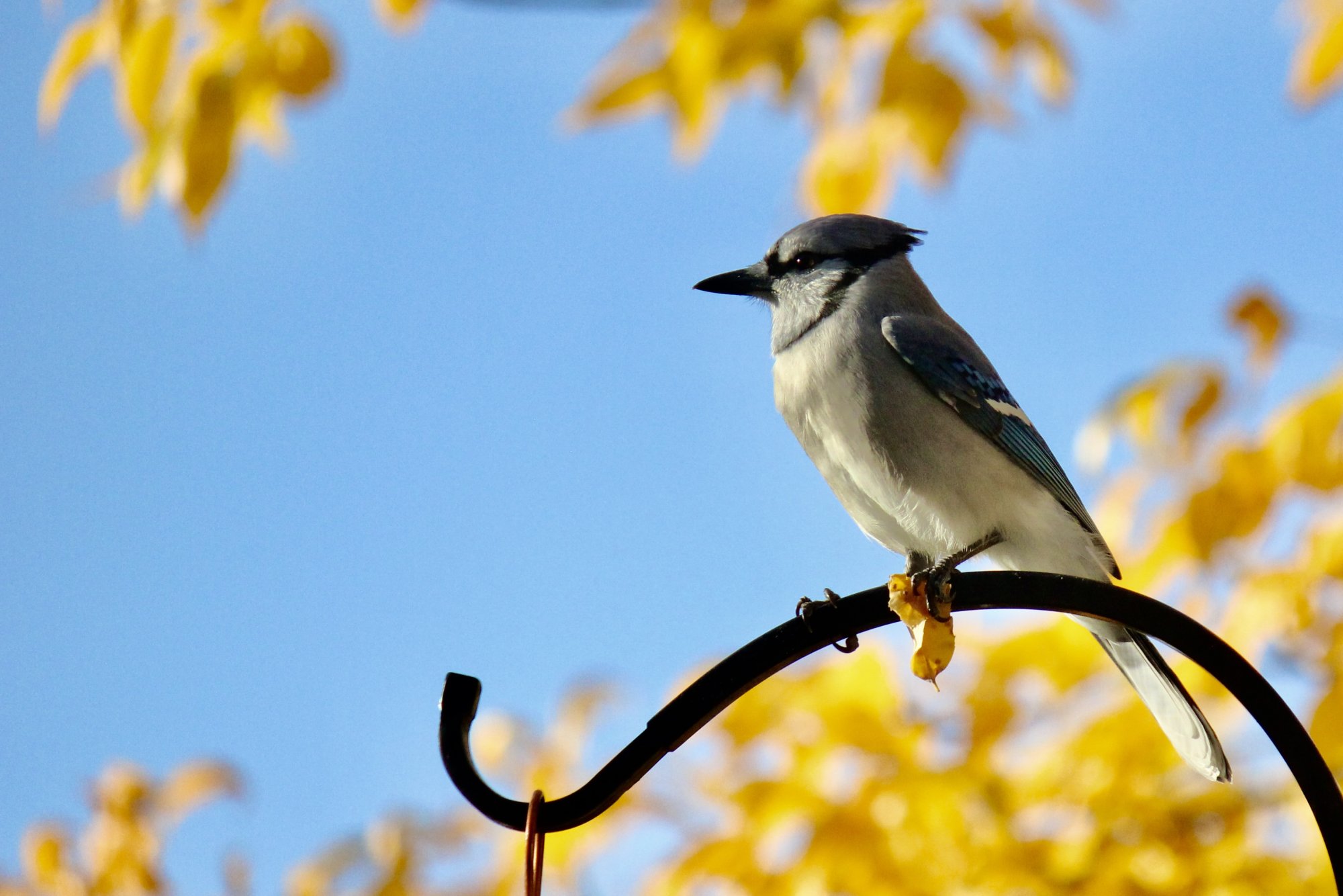Blue Jays might be the prettiest, but they are bullies compared to other birds. Even their squawking sounds bullying. 🤣Another day, another set of blue jays, lol. At the moment they are the prettiest birds visiting (now that the goldfinches have turned dull gray). This one was really playing around with that leaf, which activity I did not get a photo I liked. So here he is proudly grasping it.