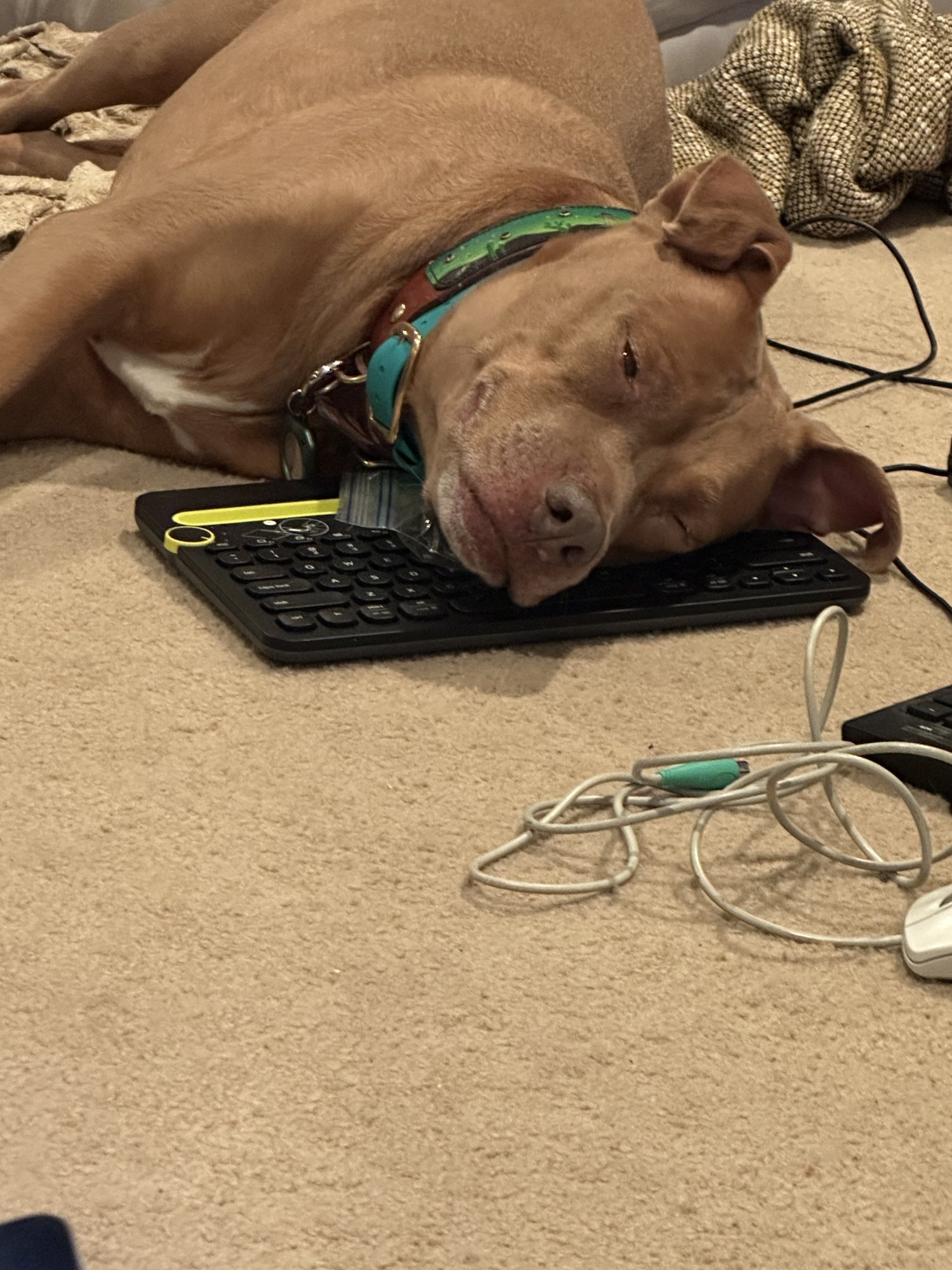 This is a common occurrence in this home. These dogs just lay anywhere they want when they want. in this case we were going through old USB cables lightning cords anything. An old accessories. This dog just lay down and said oh this is a pillow and did Her thing. Drool and she may😂I cannot count the number of times I needed to remind myself, DO NOT DROOL ON THE KEYBOARD