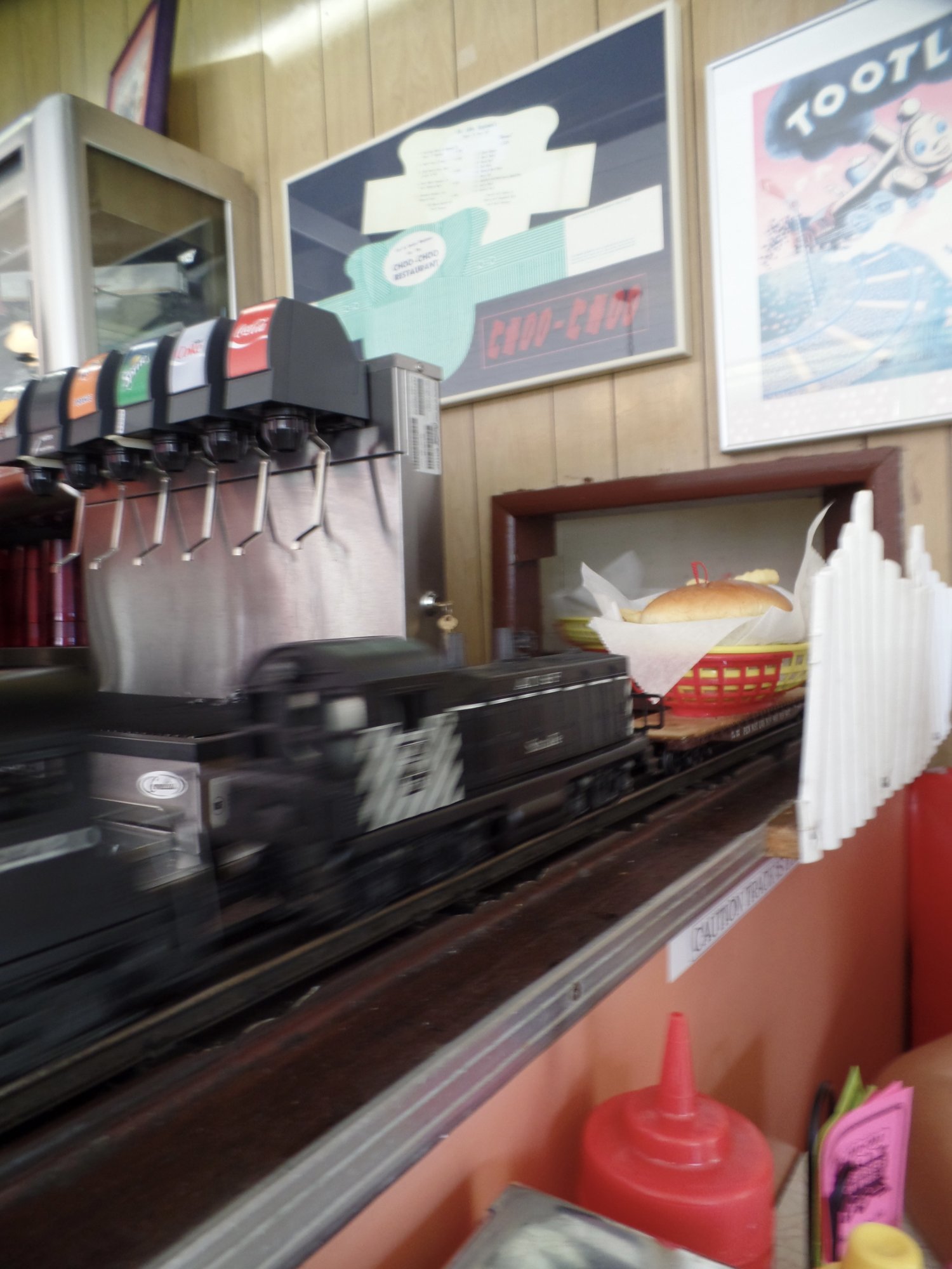 In Japan they have trains bringing sushi to your table in many restaurants, fun!From The Choo Choo, in Des Plaines, IL. This is a small dinner where their gimmick is that your food order is delivered to your table from the kitchen via a model train.