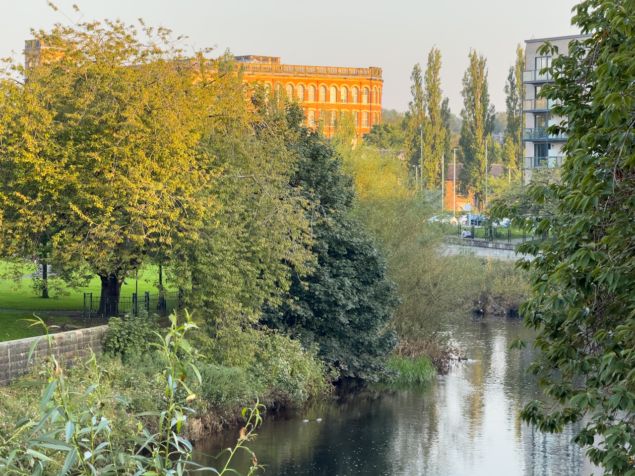 the White Cart Water flows through the centre of Paisley. The brick building in the background is the former Coats Anchor Mill, that exported cotton thread all over the world.