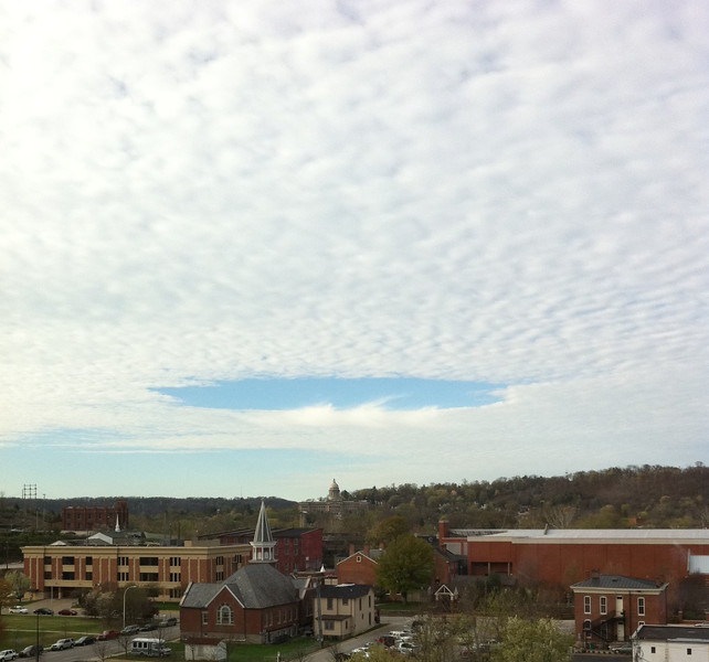 That reminds me of a cloud formation we saw moving across the sky one day at work earlier in the year. I waited until it was right over the state capitol and then snapped a few (horrible) photos with my iPhone. The capitol building is the tall building at the very back of the photo. It did just like you said, held the perfect circle all the way across the sky. Had we first seen it when it was over the capitol I would have sworn it was just from all of the hot air coming from the politicians
