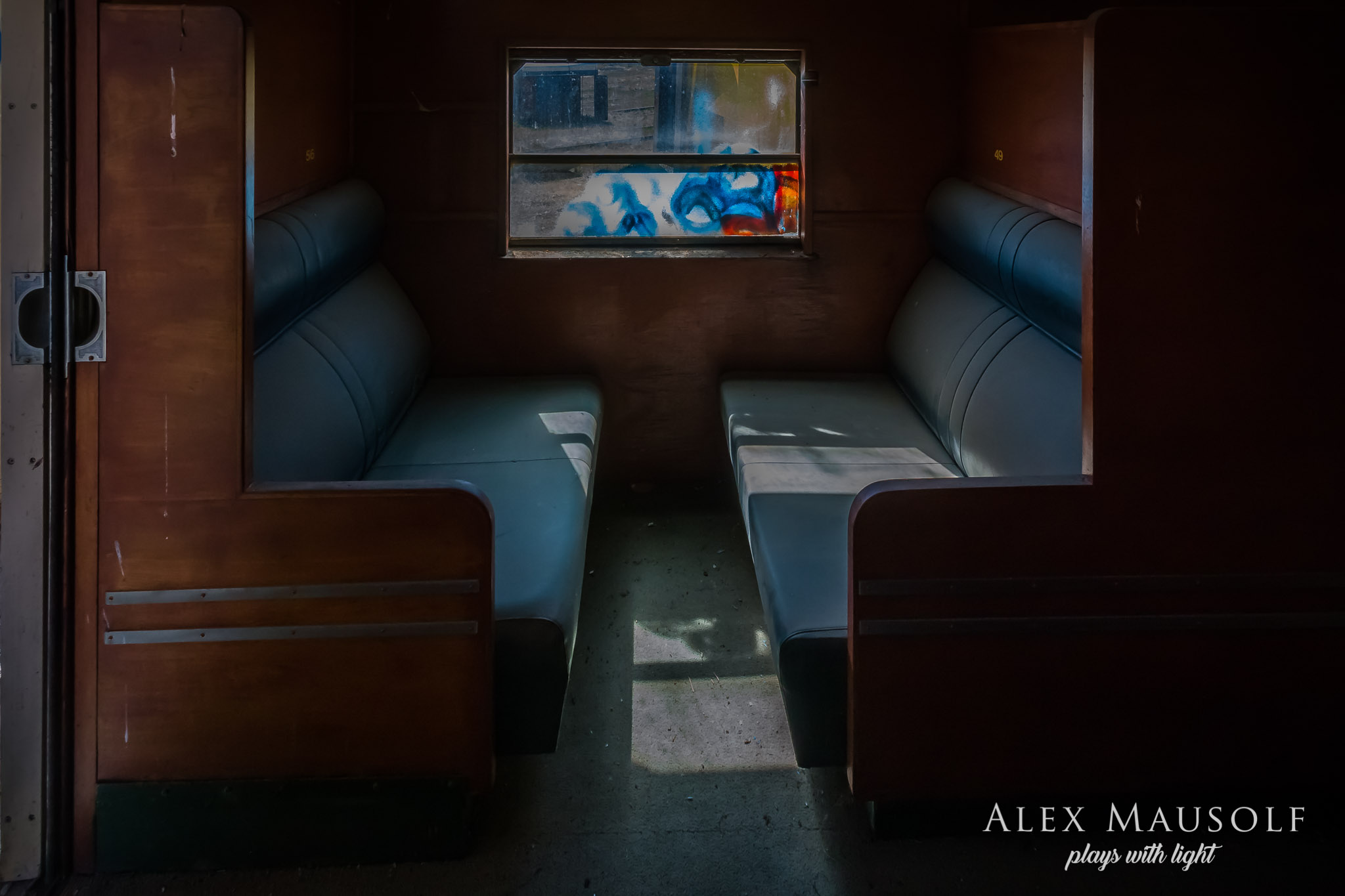 Love the graffiti in the background, subdued blue of the seats as weel as the symmetry and colours of the wood panels in the foreground plus the lighting. Something different I feel from your usual stuff and you would need some more of a similar theme or style to display but very well executed.