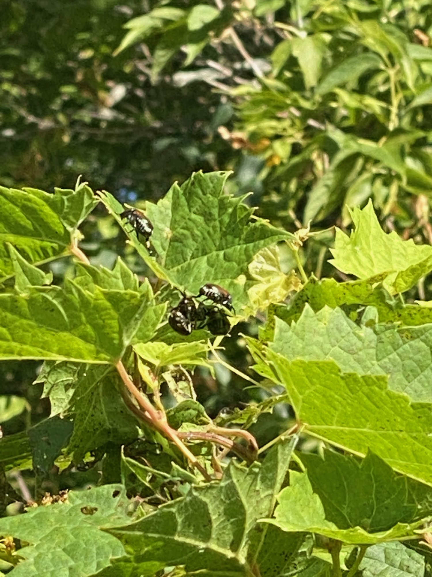 EDIT THE EDIT: And they eat my roses. One year, the first year I ever saw them, they striped my many rose bushes and several ornamental trees. I mean, striped them to branches and the thick parts of the leaves. They did it completely three years in a row. Decimated rose bushes, and all. I started catching them, and spreading a variety of 'organic' grub control measures, and now I've only caught a pair on my rose bushes. One thing that made their infestation hard to end was, I believe, the rocks I had surrounding the area. I have found hundreds of grubs in the dirt that accumulates in the rock beds. Cleaning the rocks was nothing I thought I'd have to do, but all of it together seems to be working. I used to use Starbucks Iced Coffee bottles for catching/killing them, and in the worst of it would have a bottle half full of drowned beetles. I could half fill a Nestea tea bottle in one day. I had to switch to larger bottles to serve as 'kill jars' because the smaller bottles were filling up so fast. I'd see over a dozen on one leaf. I also got into a brief argument with a Japanese beetle 'expert' who said their eyesight was 'poor'. I could hear them dropping off the leaves as soon as I got within 10 feet of the areas I harvested the damn things. They have really pretty good eyesight, but fly like they are drunk. And aren't exactly intelligent. One beetle, I tried to capture, and he flew away, only to land on the same leaf, and then flew away again, and, you guessed it, landed on the same leaf. Then I got it, it actually flew into the bottle. They supposedly were imported on some agricultural items from Japan (trees).