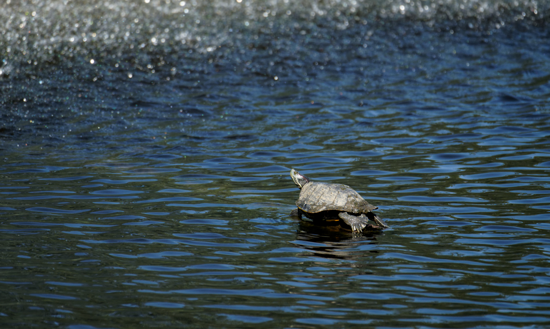 Hopefully not perched on the fountain head itselfThis enterprising turtle found himself a new place to hang out in the middle of the lake near the fountain! I think he is perched on either a limb that is submerged in the water or perhaps a pipe connected to the fountain......
