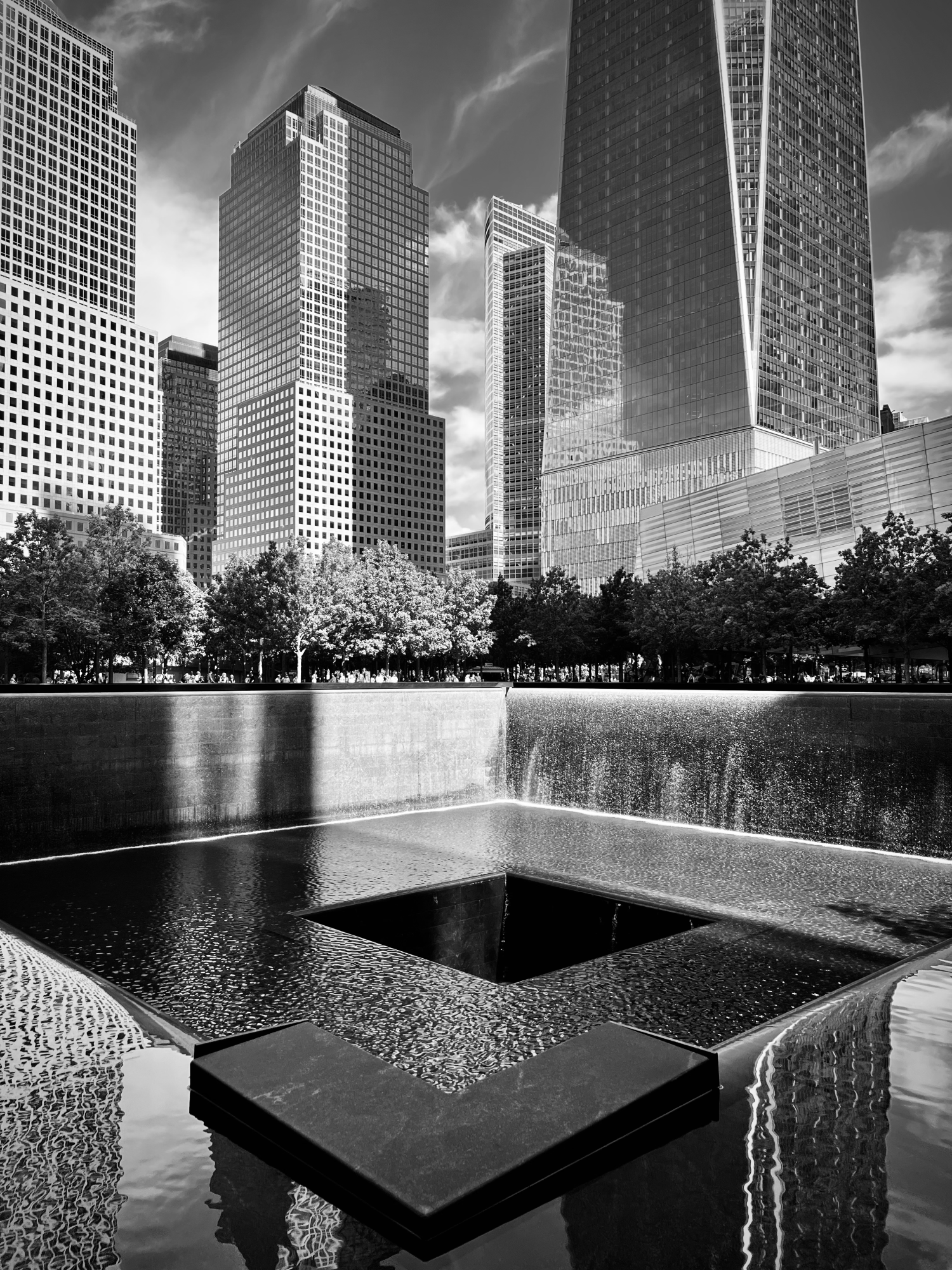 According to the architect, Michael Arad, the pools represent “absence made visible.” Although water flows into the voids, they can never be filled. The sound of the cascading water makes the pools a place of tranquility and contemplation separate from the bustling noises of the city. 🕊️