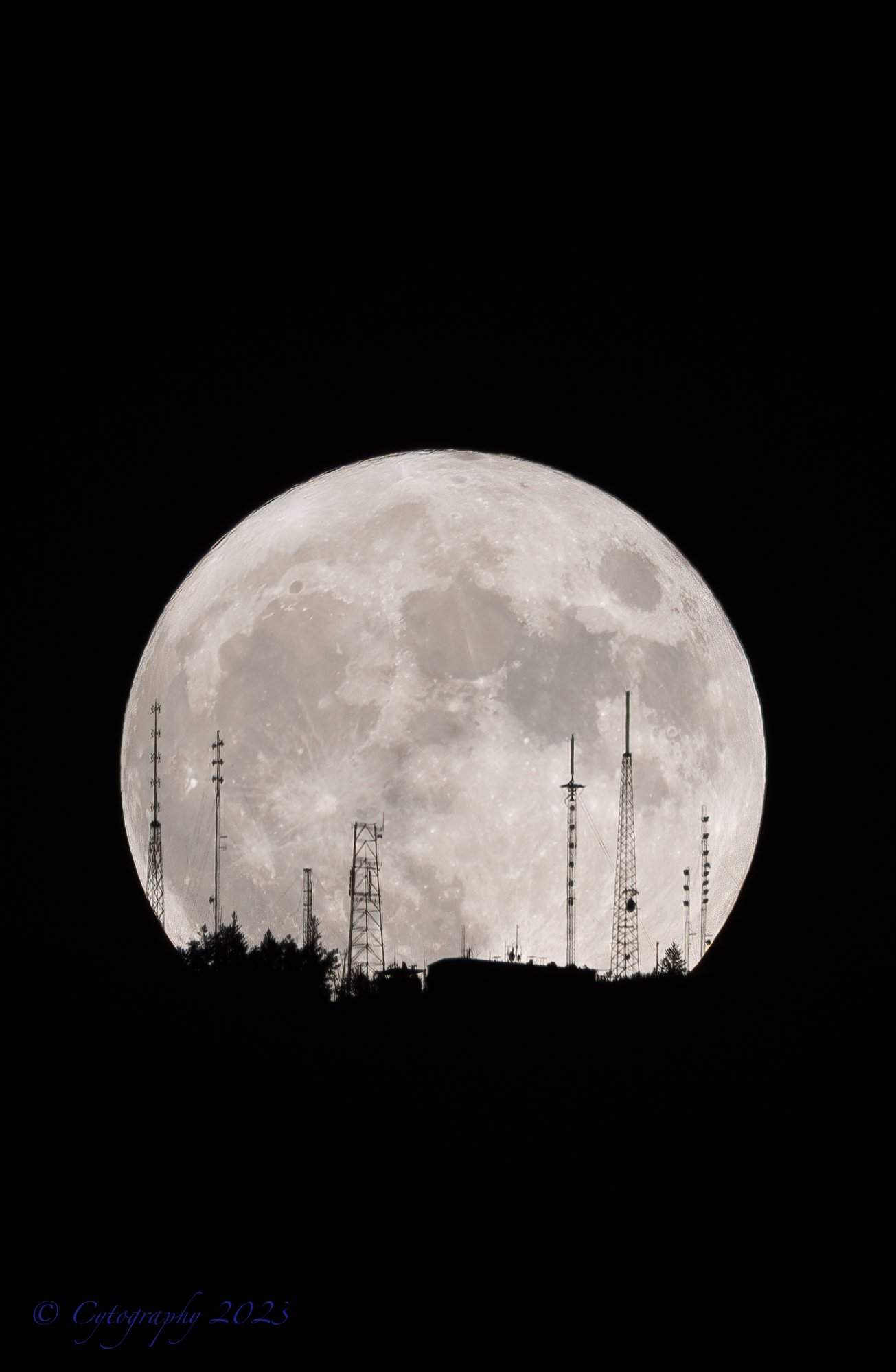 This was my first attempt to shoot a "big" moon with a long telephoto lens. I was standing on the side of a busy interstate (I-25) with my Canon R5 and a Sigma 150-600mm with a 1.4x teleconverter (so 840mm) on a Sirui Carbon Fiber tripod. I got to my planned shooting location while there was still plenty of light and focused on the antenna at the top of Sandia Crest. Since my hyperlocal distance was much closer to my location (the antenna were 10 miles away), I knew if I focused on those towers, the moon would be acceptably sharp also. Then I just waited for the moon to pop up from behind the mountain. I took several shots as the moon rose. This was the one I felt was best.