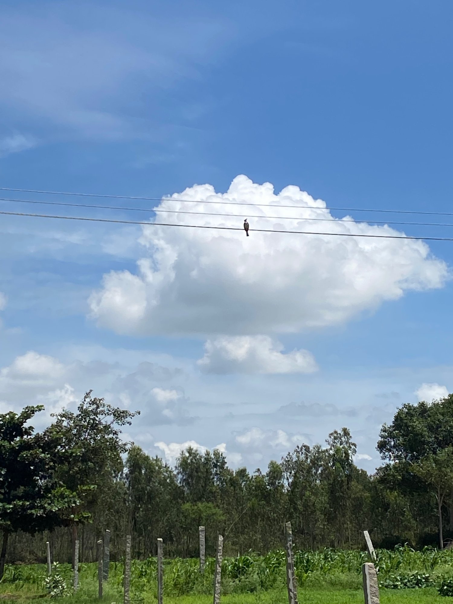 I was sitting in the yard yesterday, soaking up the sun, and saw this lone bird on the wire. The skies were also so clear that day, with a few large cloud formations. An impromptu picture, taken a bit hurriedly with my phone, before it flew off.