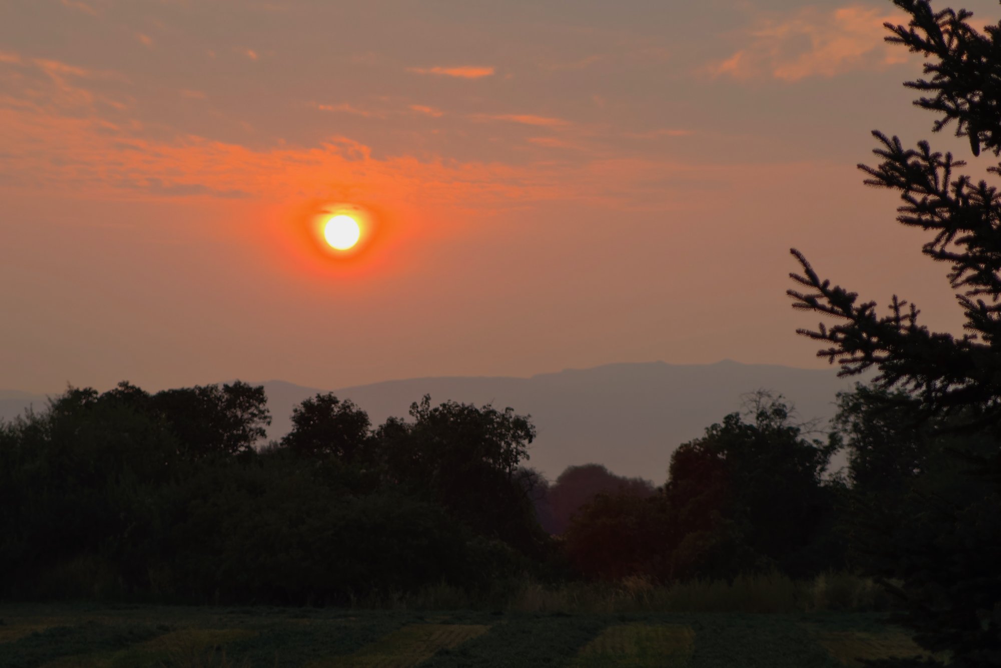 This mornings sunrise. There is a lot of smoke in the air from nearby forest fires.~