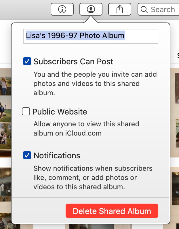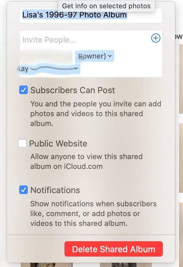 On my iMac, I set up a new Shared Album in Photos without inviting anyone to the Shared Album. Later, I wanted to add folks, so I clicked on the "person" icon, the image on the left is what I saw. The image on the right is what I saw when I tried exactly the same thing on my MacBook.