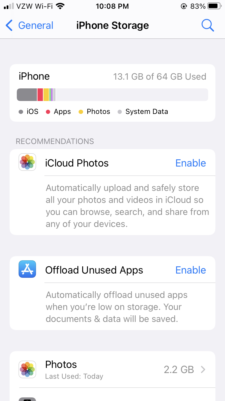 Now when I look in iPhone storage the 2.2gb of data is still sitting under Photos. If we look at iCloud Photos now we can see it doesn't have data to upload anymore it just suggests turning it on.