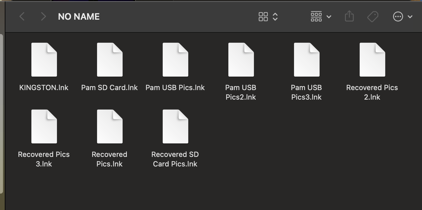 As a Windows user, the LNK files you have are just shortcuts, they are just pointer files to the actual files/folders... They are not JPEG files that you were trying to save... They will only work while you have the drive connected to the Windows computer...