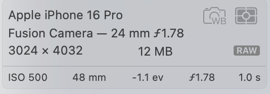 Apple iPhone 16 Pro Max (1x, 24mm, 0.01s, f/1.7, ISO 50, 11.59MP)