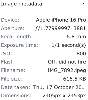 Apple iPhone 16 Pro Max (1x, 24mm, 1s, f/1.7, ISO 50, 12.19MP)