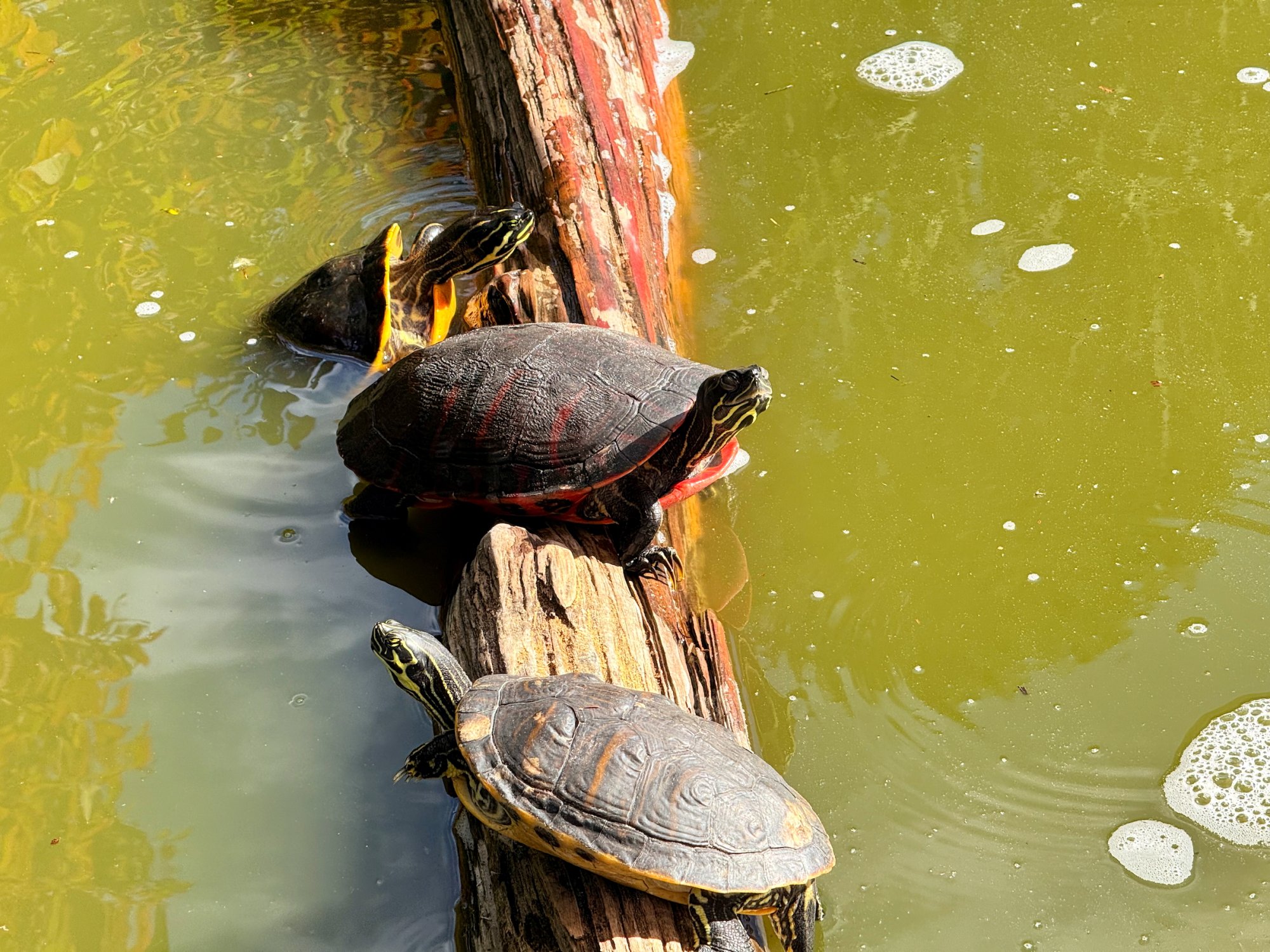 Turtles on a log.