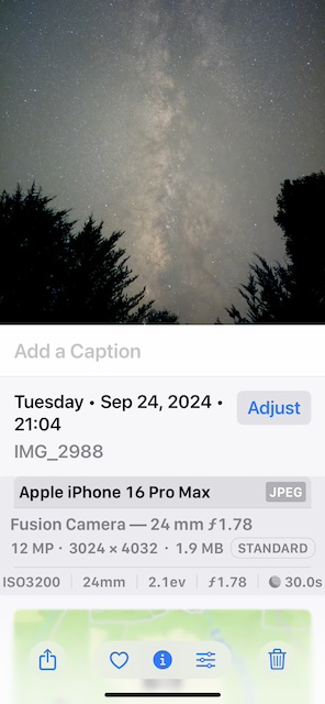 Even though I was shooting the same sky, the ISO reported in the photos info varied between shots of the same phone and between phones. But I had shots with the 15PM and the 16PM with the same ISO, 3200, shown below, no processing other than cropping in Mac Preview.