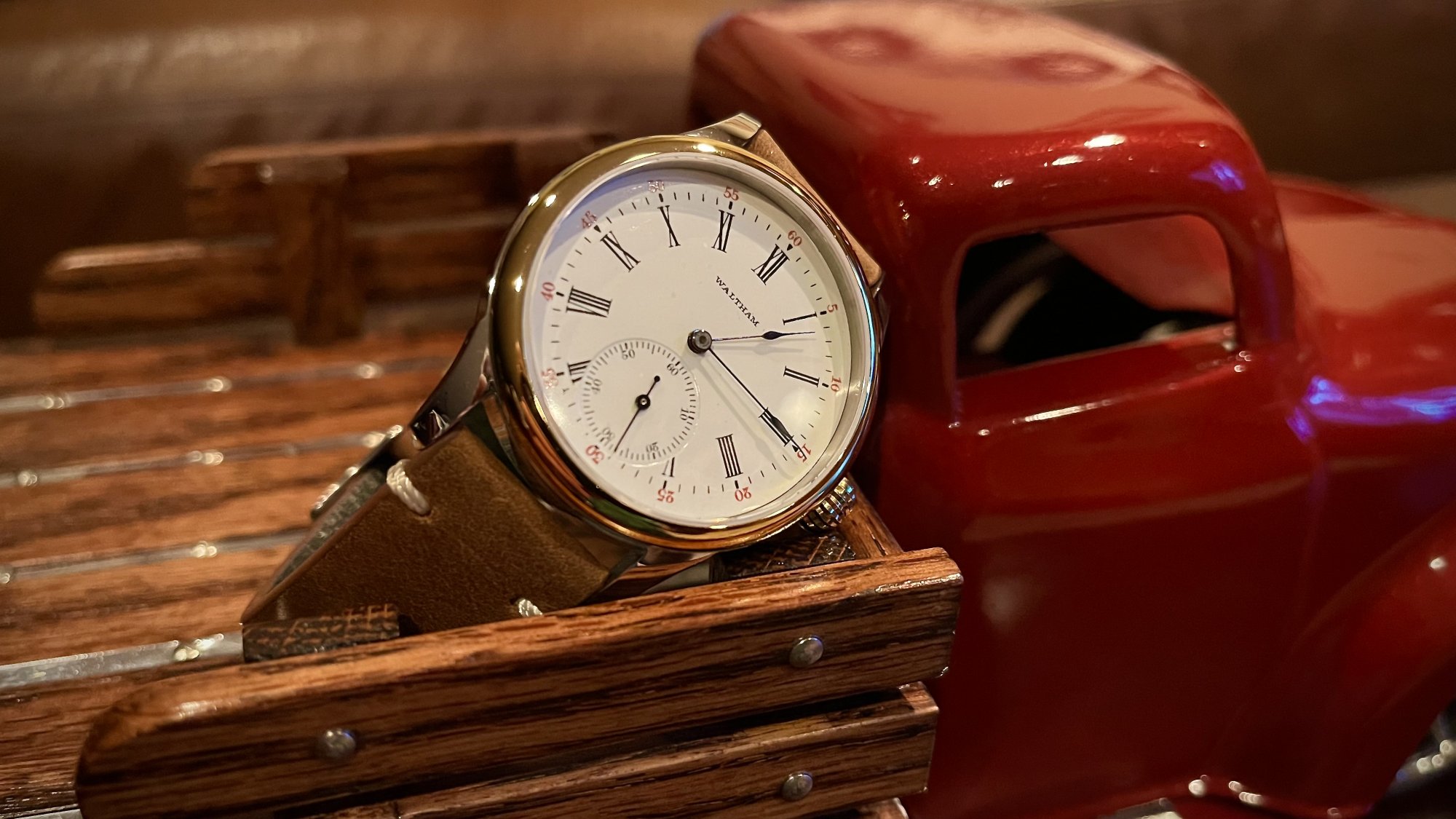 Circa 1900 Waltham pocket watch installed in a wristwatch case, sitting in the bed of a 1955 Tonka truck.